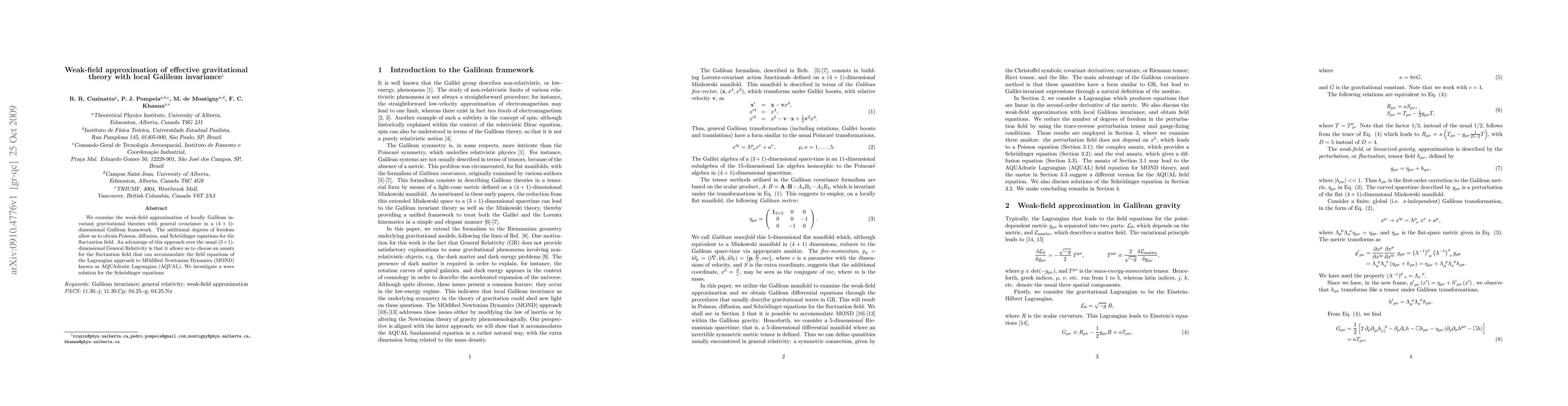 This paper explores the weak-field approximation of locally Galilean invariant gravitational theories in a $(4+1)$-dimensional framework, deriving Poisson, diffusion, and Schrödinger equations for the fluctuation field. It highlights the advantage of this approach over General Relativity by accommodating the AQUAL Lagrangian for MOND, and investigates wave solutions for the Schrödinger equations.