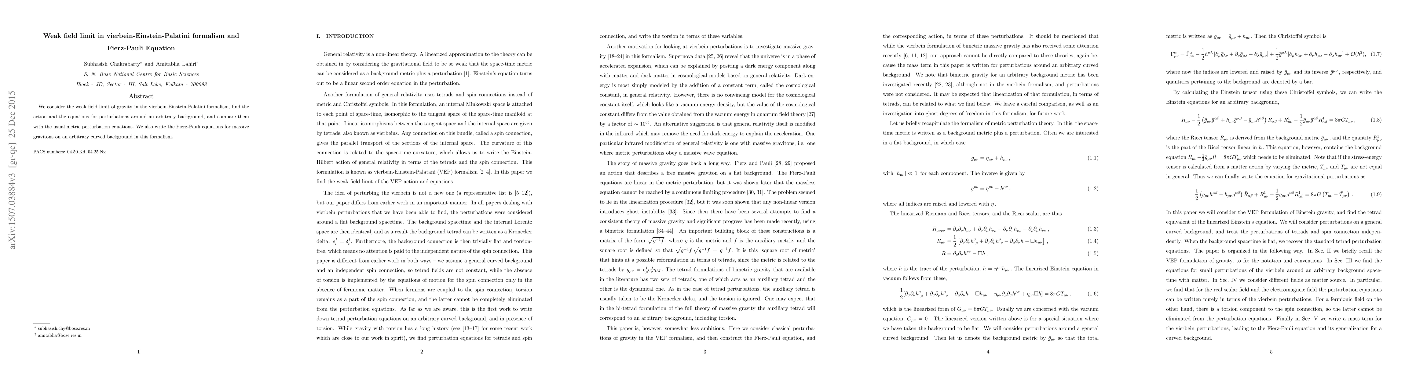This paper investigates the weak field limit of gravity using the vierbein-Einstein-Palatini formalism, deriving the action and perturbation equations, and compares them with metric perturbation equations. It also formulates the Fierz-Pauli equations for massive gravitons in this formalism on an arbitrary curved background.