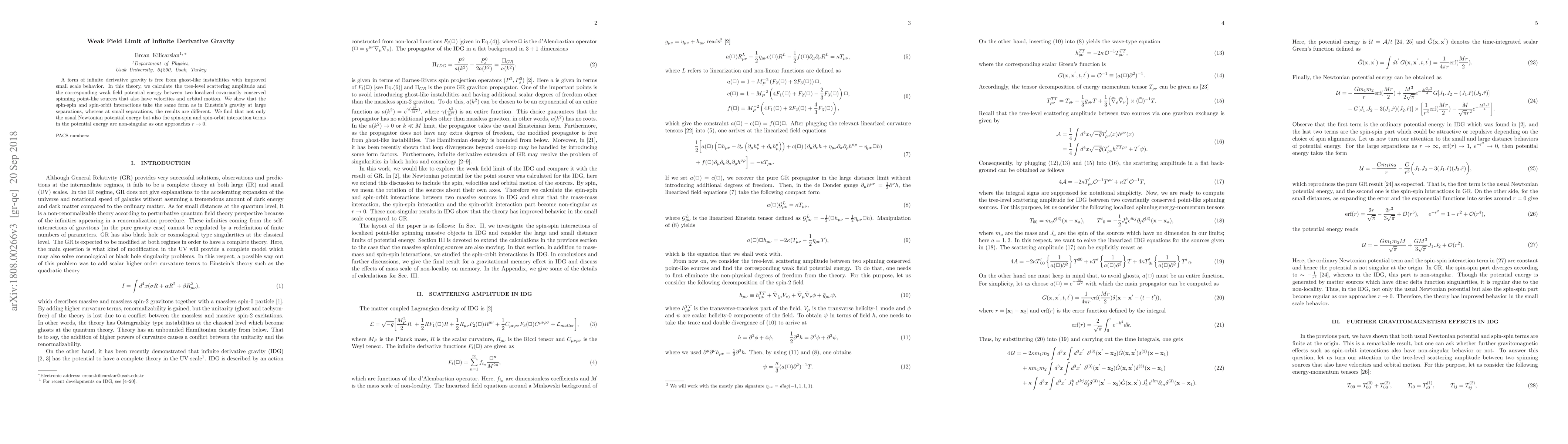 The research explores infinite derivative gravity, demonstrating it lacks ghost instabilities and exhibits better small scale behavior than standard theories. Calculations of scattering amplitudes and weak field potential energy between spinning point-like sources reveal that spin-spin and spin-orbit interactions mirror Einstein's gravity at large distances but differ at small distances. Notably, the potential energy terms, including Newtonian, spin-spin, and spin-orbit, remain non-singular as separation approaches zero.