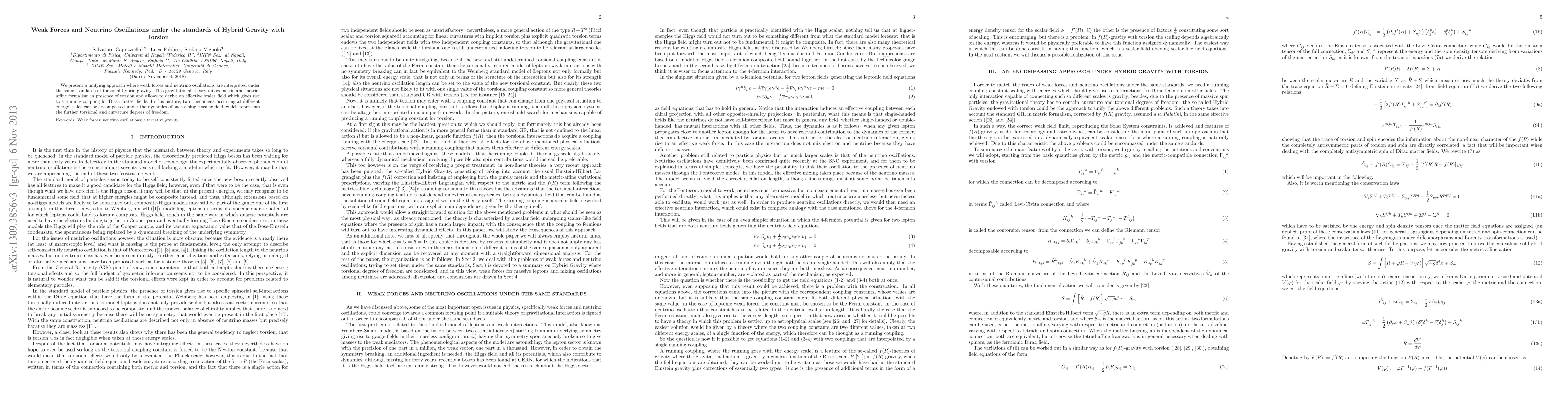 This paper presents a new approach to understanding weak forces and neutrino oscillations in hybrid gravity with torsion, proposing a single scalar field that encompasses both phenomena at different energy scales.