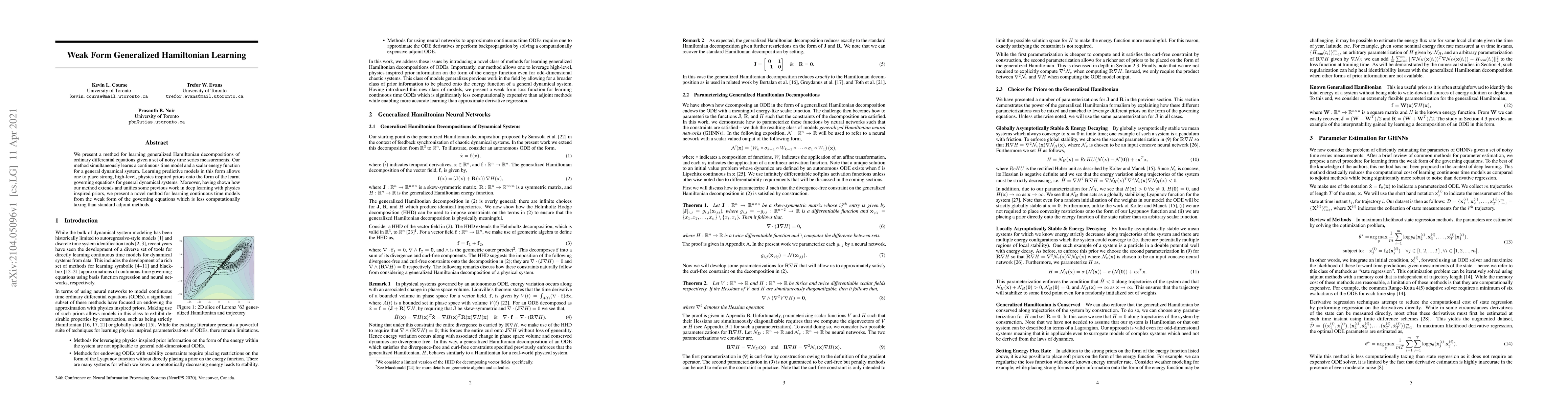 We present a method for learning generalized Hamiltonian decompositions of ordinary differential equations given a set of noisy time series measurements. Our method simultaneously learns a continuous time model and a scalar energy function for a general dynamical system. Learning predictive models in this form allows one to place strong, high-level, physics inspired priors onto the form of the learnt governing equations for general dynamical systems. Moreover, having shown how our method extends and unifies some previous work in deep learning with physics inspired priors, we present a novel method for learning continuous time models from the weak form of the governing equations which is less computationally taxing than standard adjoint methods.