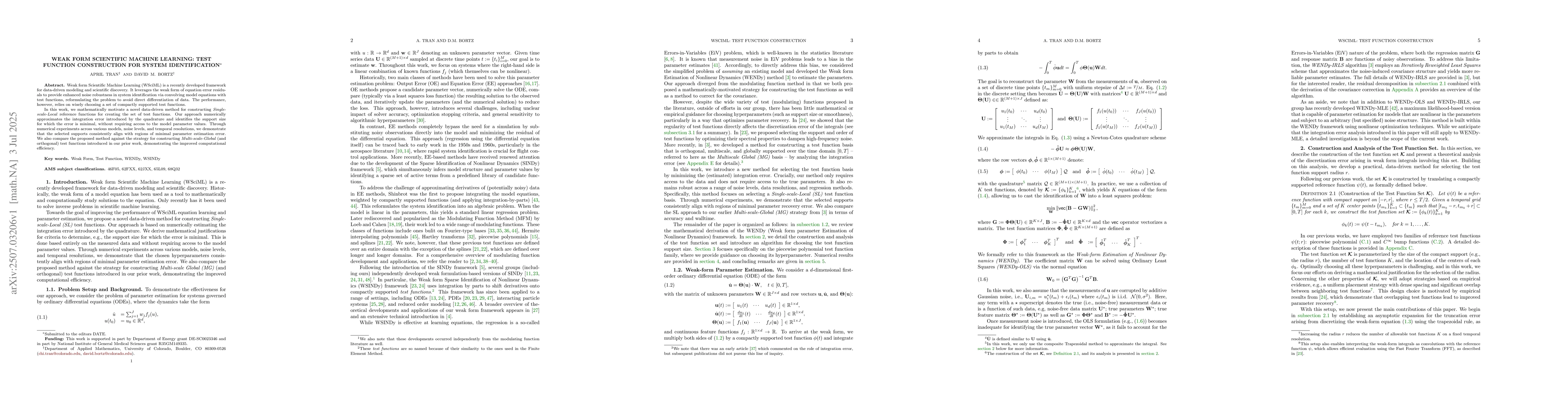 Weak form Scientific Machine Learning (WSciML) is a recently developed framework for data-driven modeling and scientific discovery. It leverages the weak form of equation error residuals to provide enhanced noise robustness in system identification via convolving model equations with test functions, reformulating the problem to avoid direct differentiation of data. The performance, however, relies on wisely choosing a set of compactly supported test functions. In this work, we mathematically motivate a novel data-driven method for constructing Single-scale-Local reference functions for creating the set of test functions. Our approach numerically approximates the integration error introduced by the quadrature and identifies the support size for which the error is minimal, without requiring access to the model parameter values. Through numerical experiments across various models, noise levels, and temporal resolutions, we demonstrate that the selected supports consistently align with regions of minimal parameter estimation error. We also compare the proposed method against the strategy for constructing Multi-scale-Global (and orthogonal) test functions introduced in our prior work, demonstrating the improved computational efficiency.
