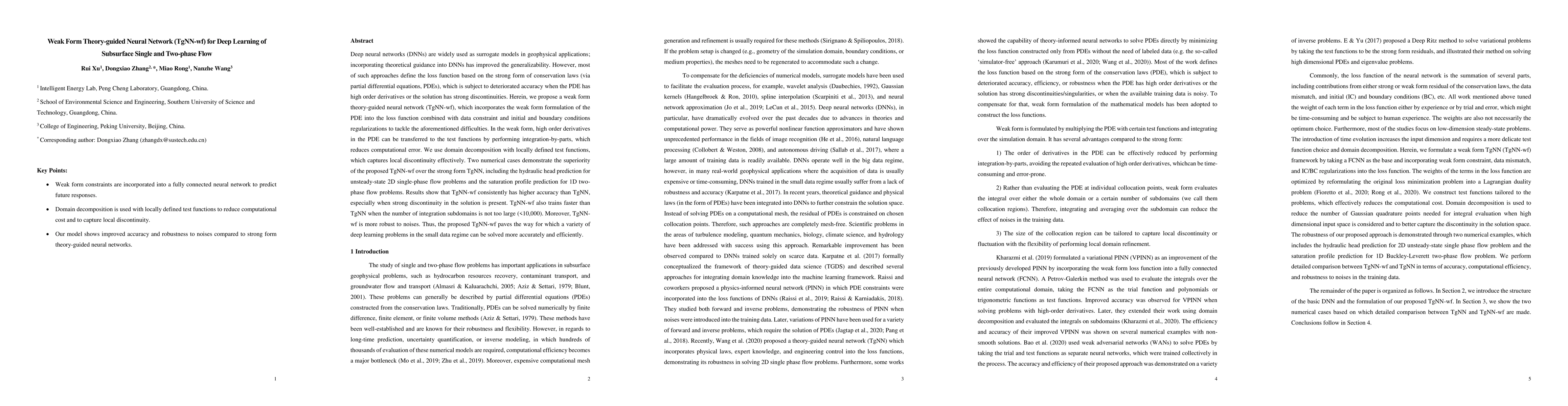The paper proposes a weak form theory-guided neural network (TgNN-wf) to enhance deep learning models for subsurface flow simulations. TgNN-wf incorporates the weak form of PDEs into the loss function, which improves accuracy and robustness, especially for problems with high-order derivatives or strong discontinuities.