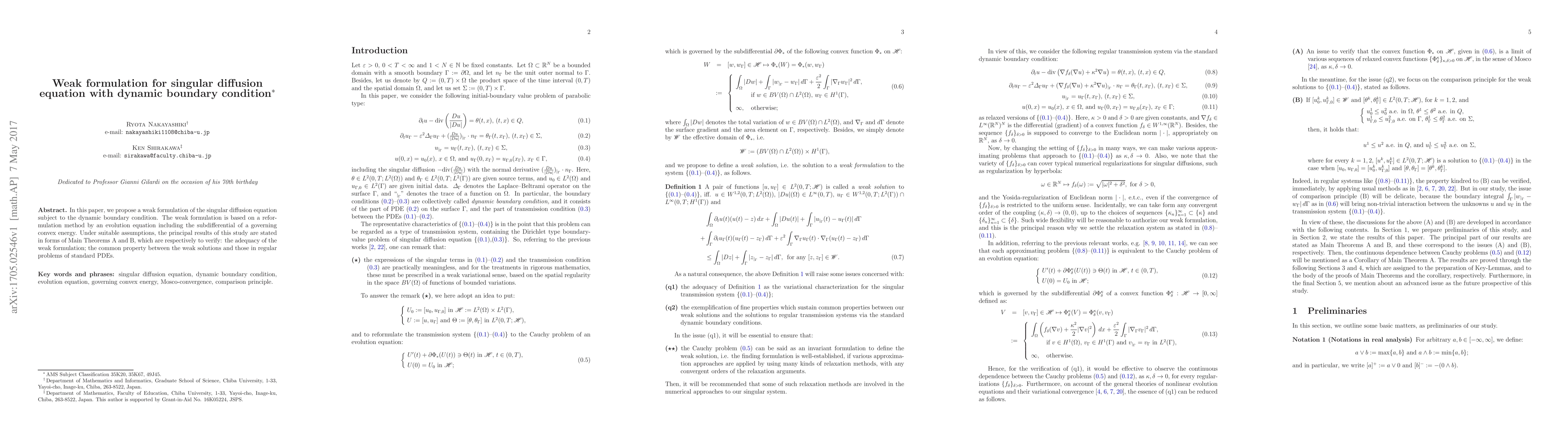 This paper proposes a weak formulation for a singular diffusion equation with a dynamic boundary condition, utilizing a reformulation method involving an evolution equation and the subdifferential of a convex energy. The study verifies the adequacy of the weak formulation and establishes properties shared with solutions of regular PDE problems.