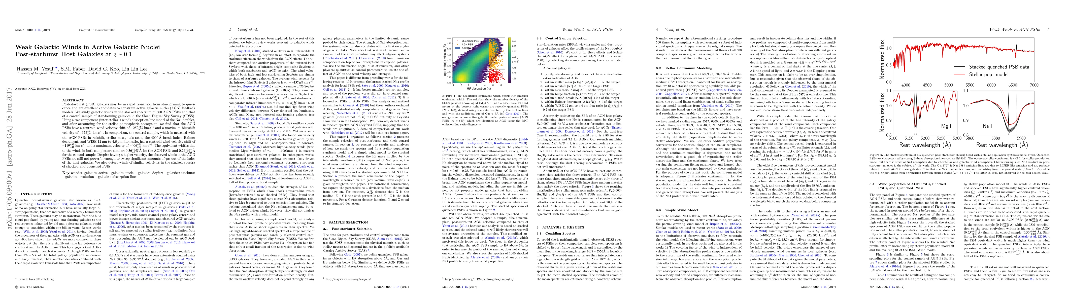 Post-starburst (PSB) galaxies may be in rapid transition from star-forming to quiescence and are excellent candidates to constrain active galactic nuclei (AGN) feedback models. We study galactic winds in the stacked spectrum of 560 AGN PSBs and that of a control sample of star-forming galaxies in the Sloan Digital Sky Survey (SDSS). Using a two component (inter-stellar +wind) absorption-line model of the \ion{Na}{i} doublet, and after accounting for the stellar photospheric absorption, we find that the AGN PSBs have a centroid wind velocity shift of $-252^{+64}_{-57}$ km s$^{-1}$ and a maximum blueshift velocity of $-678^{+54}_{-53}$ km s$^{-1}$. In comparison, the control sample, which is matched with the AGN PSBs in redshift, stellar mass, axis-ratio, the 4000 {\AA} break index, Balmer decrement, and WISE 12 $\mu$m to 4.6 $\mu$m flux ratio, has a centroid wind velocity shift of $-119^{+33}_{-41}$ km s$^{-1}$ and a maximum velocity of $-406^{+51}_{-61}$ km s$^{-1}$. The equivalent widths due to the winds in both samples are similar: $0.36^{+0.10}_{-0.07}$ {\AA} for the AGN PSBs and $0.24^{+0.07}_{-0.06} $ {\AA} for the control sample. Despite having a higher velocity, the observed winds in the AGN PSBs are still not powerful enough to sweep significant amounts of gas out of the halos of the host galaxies. We also detect winds of similar velocities in the stacked spectra of shocked and quenched PSBs.