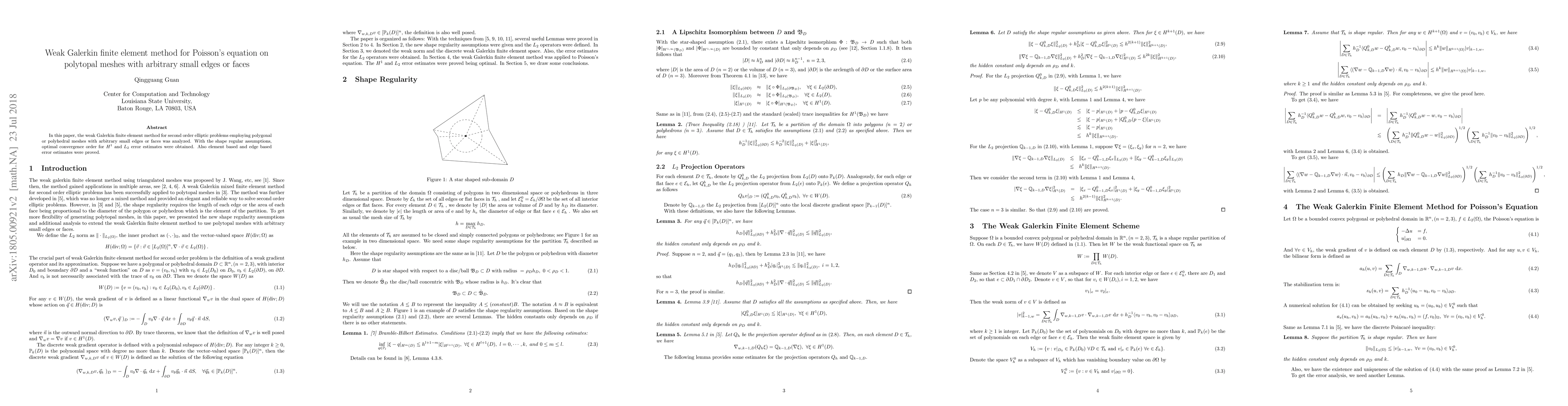 This paper analyzes the weak Galerkin finite element method for solving Poisson's equation on polytopal meshes, demonstrating optimal convergence for $H^1$ and $L_2$ error estimates under shape regularity. The study also proves element-based and edge-based error estimates.