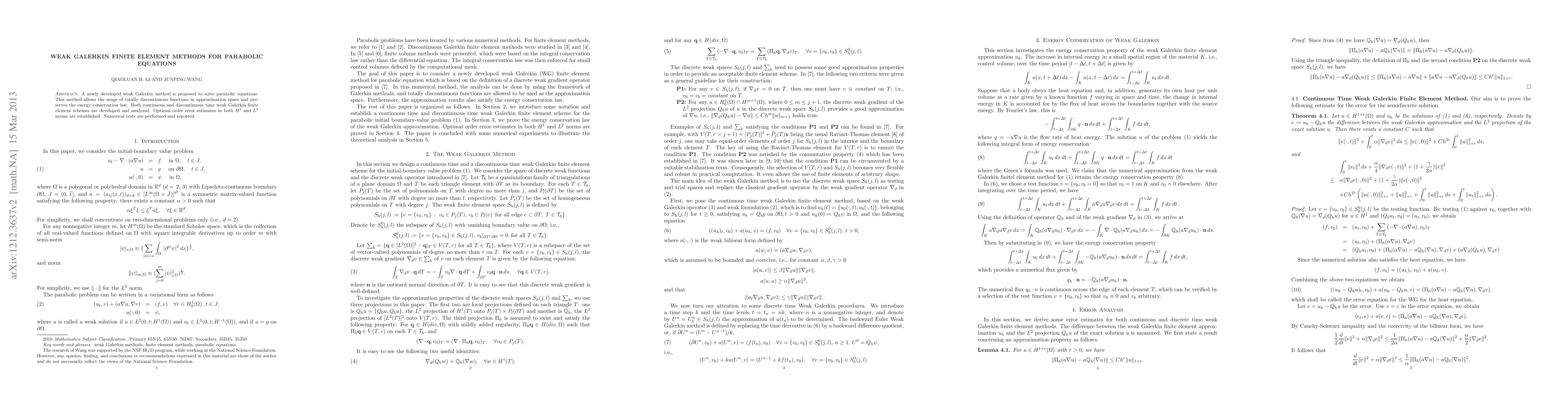 This paper introduces a new weak Galerkin finite element method for solving parabolic equations, utilizing discontinuous functions and ensuring energy conservation. It presents both continuous and discontinuous time schemes, proves optimal error estimates, and demonstrates effectiveness through numerical tests.