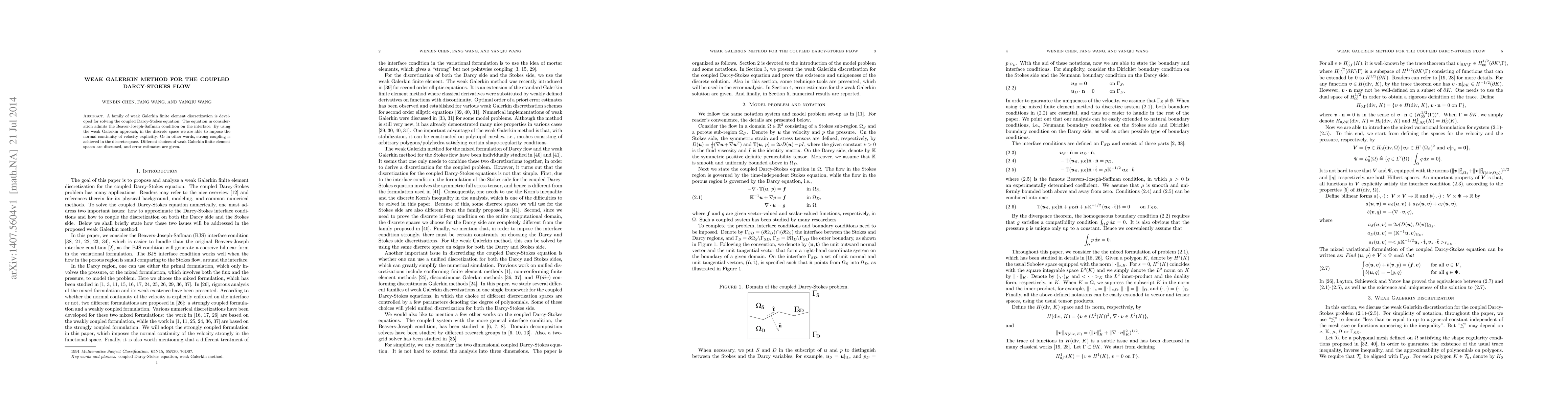 A family of weak Galerkin finite element discretization is developed for solving the coupled Darcy-Stokes equation. The equation in consideration admits the Beaver-Joseph-Saffman condition on the interface. By using the weak Galerkin approach, in the discrete space we are able to impose the normal continuity of velocity explicitly. Or in other words, strong coupling is achieved in the discrete space. Different choices of weak Galerkin finite element spaces are discussed, and error estimates are given.