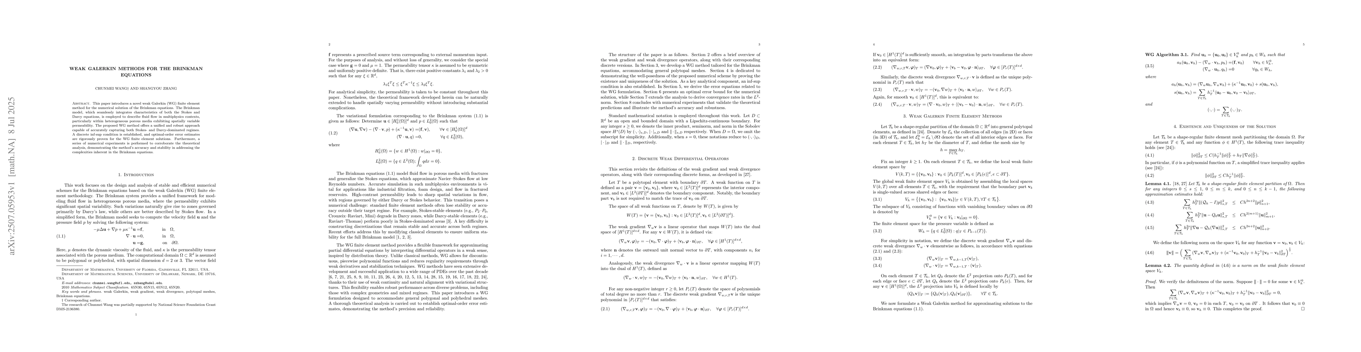 This paper introduces a novel weak Galerkin (WG) finite element method for the numerical solution of the Brinkman equations. The Brinkman model, which seamlessly integrates characteristics of both the Stokes and Darcy equations, is employed to describe fluid flow in multiphysics contexts, particularly within heterogeneous porous media exhibiting spatially variable permeability. The proposed WG method offers a unified and robust approach capable of accurately capturing both Stokes- and Darcy-dominated regimes. A discrete inf-sup condition is established, and optimal-order error estimates are rigorously proven for the WG finite element solutions. Furthermore, a series of numerical experiments is performed to corroborate the theoretical analysis, demonstrating the method's accuracy and stability in addressing the complexities inherent in the Brinkman equations.