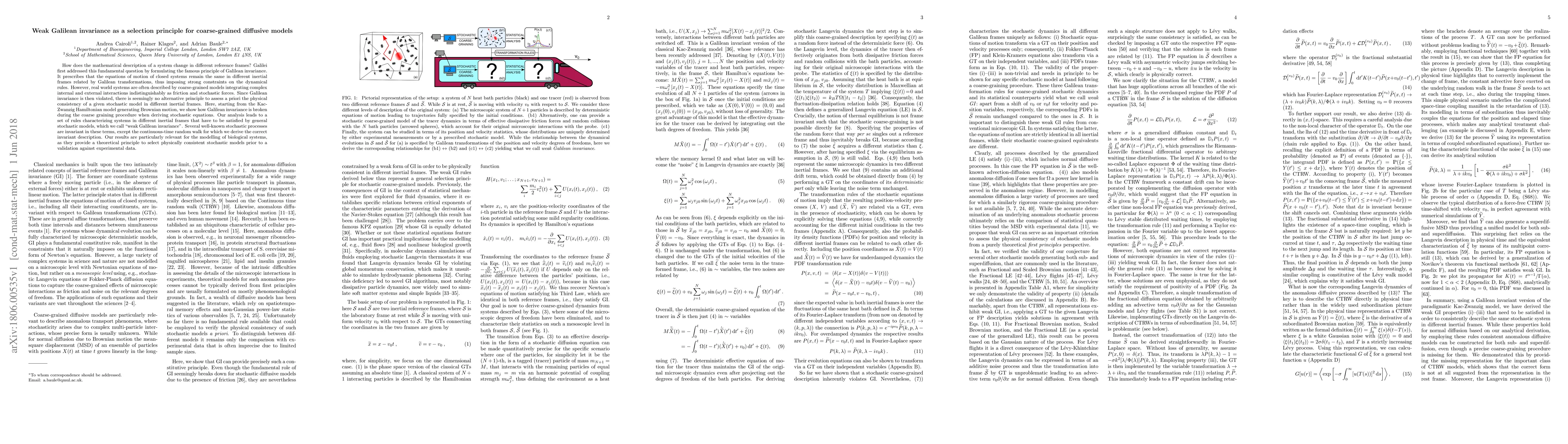 Galilean invariance is a cornerstone of classical mechanics. It states that for closed systems the equations of motion of the microscopic degrees of freedom do not change under Galilean transformations to different inertial frames. However, the description of real world systems usually requires coarse-grained models integrating complex microscopic interactions indistinguishably as friction and stochastic forces, which intrinsically violate Galilean invariance. By studying the coarse-graining procedure in different frames, we show that alternative rules -- denoted as "weak Galilean invariance" -- need to be satisfied by these stochastic models. Our results highlight that diffusive models in general can not be chosen arbitrarily based on the agreement with data alone but have to satisfy weak Galilean invariance for physical consistency.