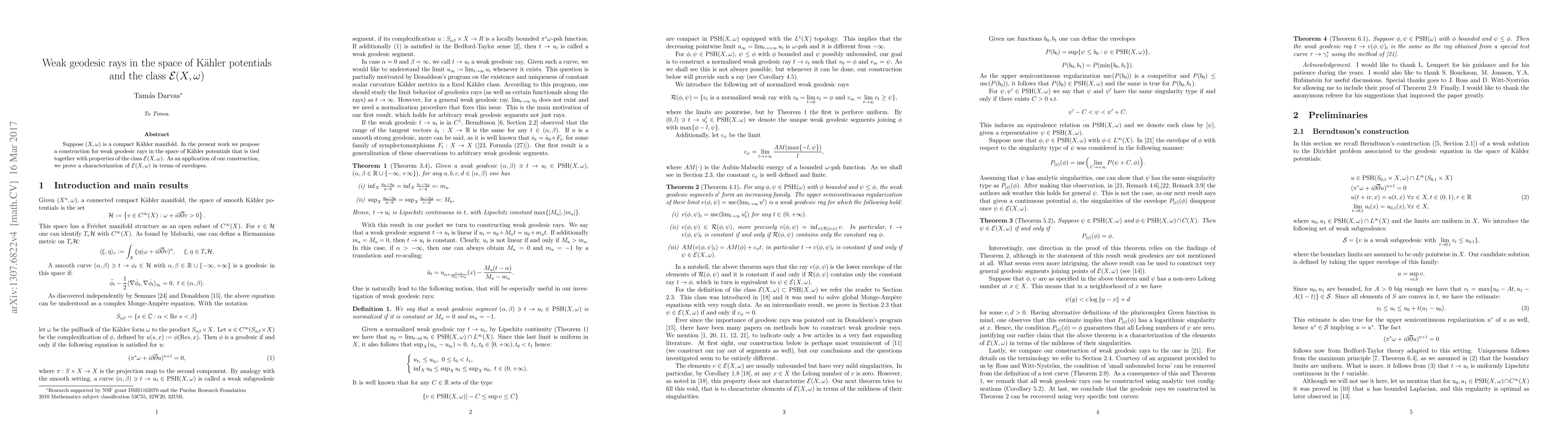 Suppose (X,\omega) is a compact K\"ahler manifold. In the present work we propose a simple construction for weak geodesic rays in the space of K\"ahler metrics that seems to be tied together with properties of the class E(X,\omega). As an application of our construction, we prove a characterization of E(X,\omega) in terms of envelopes.