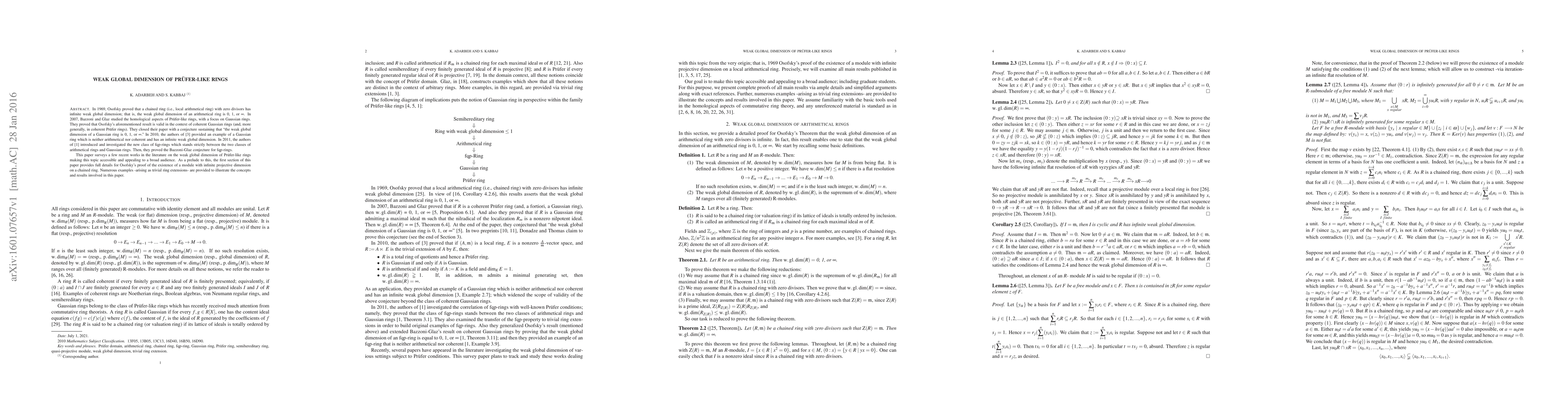 In 1969, Osofsky proved that a chained ring (i.e., local arithmetical ring) with zero divisors has infinite weak global dimension; that is, the weak global dimension of an arithmetical ring is 0, 1, or infinite. In 2007, Bazzoni and Glaz studied the homological aspects of Prufer-like rings, with a focus on Gaussian rings. They proved that Osofsky's aforementioned result is valid in the context of coherent Gaussian rings (and, more generally, in coherent Prufer rings). They closed their paper with a conjecture sustaining that ``the weak global dimension of a Gaussian ring is 0, 1, or infinite. In 2010, Bakkari-Kabbaj-Mahdou provided an example of a Gaussian ring which is neither arithmetical nor coherent and has an infinite weak global dimension. In 2011, Abuhlail-Jarrar-Kabbaj introduced and investigated the new class of fqp-rings which stands strictly between the two classes of arithmetical rings and Gaussian rings. Then, they proved the Bazzoni-Glaz conjecture for fqp-rings. This paper surveys a few recent works in the literature on the weak global dimension of Prufer-like rings making this topic accessible and appealing to a broad audience. As a prelude to this, the first section of this paper provides full details for Osofsky's proof of the existence of a module with infinite projective dimension on a chained ring. Numerous examples -arising as trivial ring extensions- are provided to illustrate the concepts and results involved in this paper.