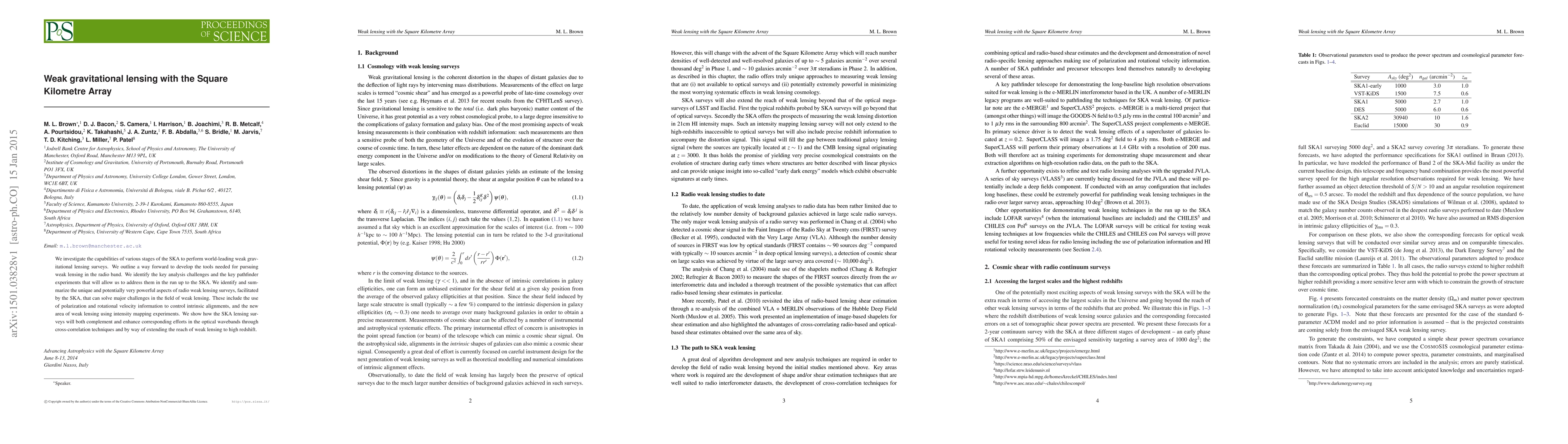 We investigate the capabilities of various stages of the SKA to perform world-leading weak gravitational lensing surveys. We outline a way forward to develop the tools needed for pursuing weak lensing in the radio band. We identify the key analysis challenges and the key pathfinder experiments that will allow us to address them in the run up to the SKA. We identify and summarize the unique and potentially very powerful aspects of radio weak lensing surveys, facilitated by the SKA, that can solve major challenges in the field of weak lensing. These include the use of polarization and rotational velocity information to control intrinsic alignments, and the new area of weak lensing using intensity mapping experiments. We show how the SKA lensing surveys will both complement and enhance corresponding efforts in the optical wavebands through cross-correlation techniques and by way of extending the reach of weak lensing to high redshift.