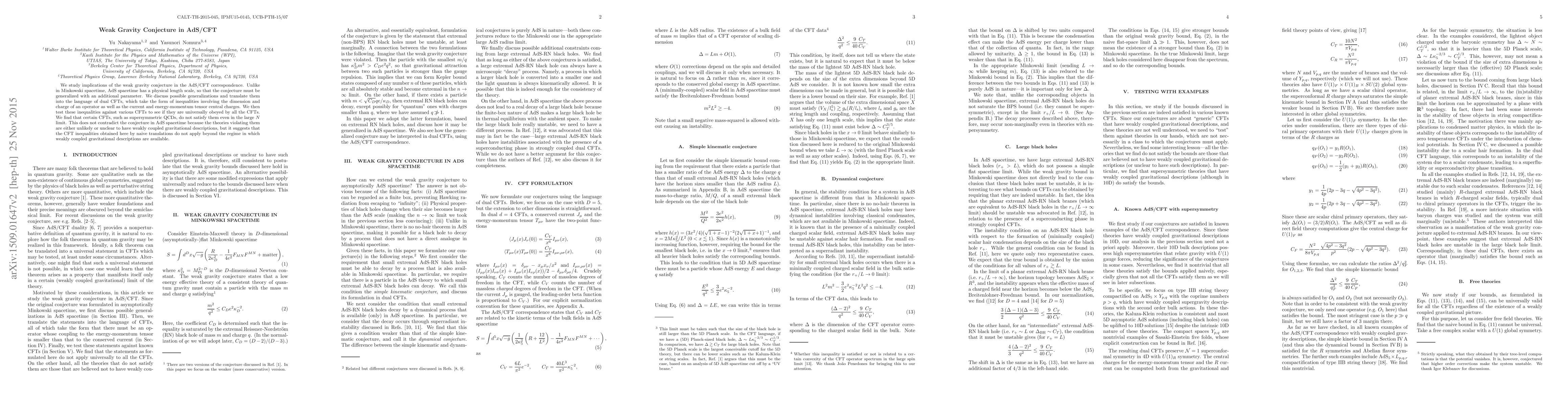 The paper explores the implications of the weak gravity conjecture within the AdS/CFT framework, proposing generalized forms that incorporate the physical length scale of AdS spacetime. It finds that while certain supersymmetric QCDs do not satisfy these inequalities, this does not invalidate the conjecture as these theories are unlikely to have weakly coupled gravitational descriptions.