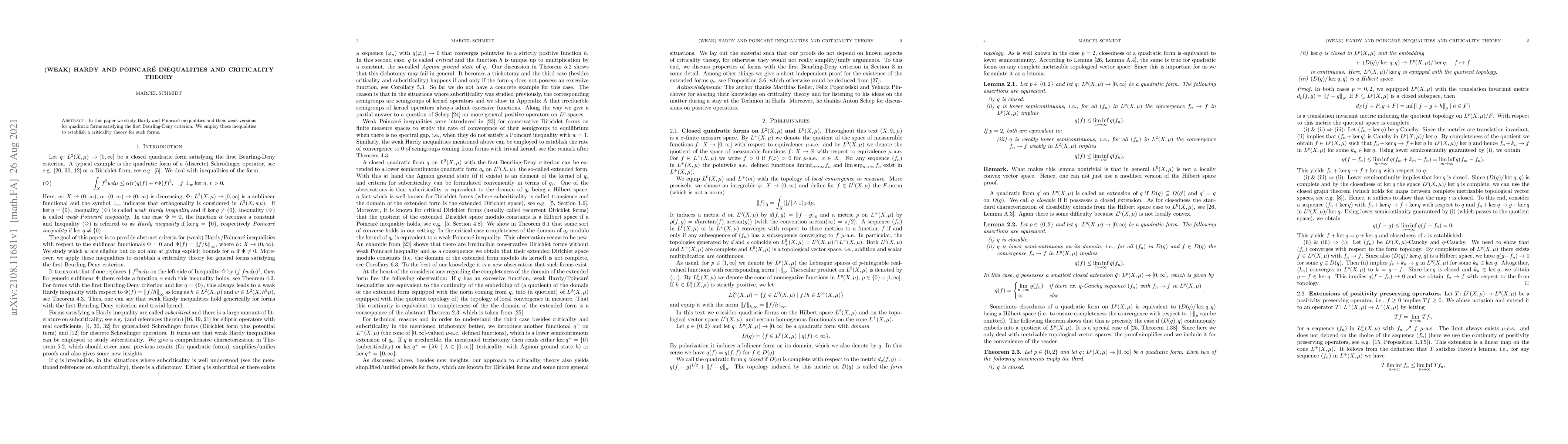 This paper investigates weak Hardy and Poincaré inequalities for quadratic forms meeting the first Beurling-Deny criterion, and uses these inequalities to develop a criticality theory for such forms.