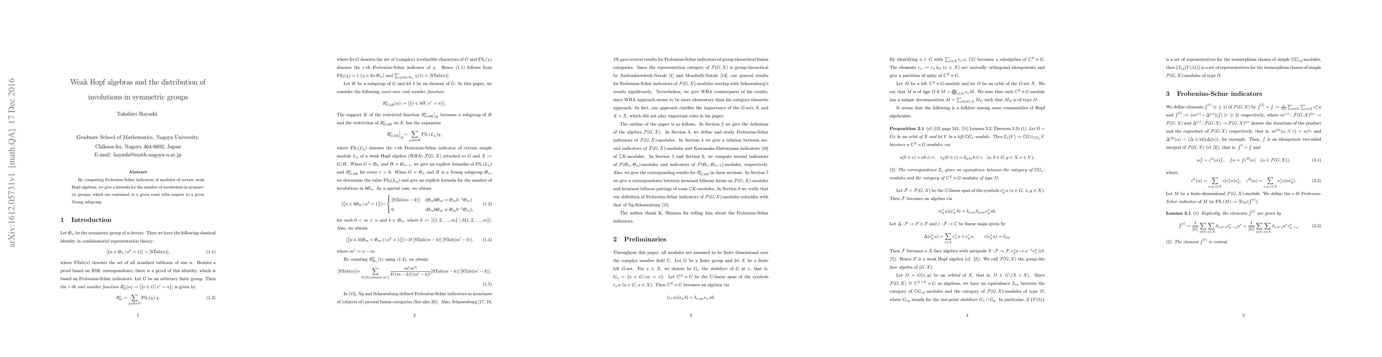 By computing Frobenius-Schur indicators of modules of certain weak Hopf algebras, we give a formula for the number of involutions in symmetric groups, which are contained in a given coset with respect to a given Young subgroup.