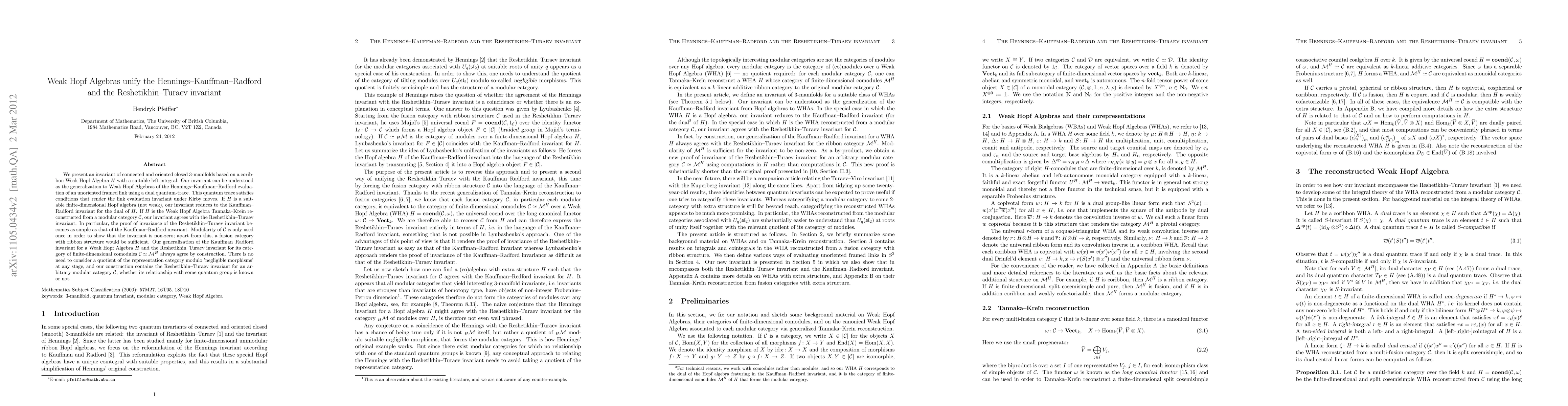 We present an invariant of connected and oriented closed 3-manifolds based on a coribbon Weak Hopf Algebra H with a suitable left-integral. Our invariant can be understood as the generalization to Weak Hopf Algebras of the Hennings-Kauffman-Radford evaluation of an unoriented framed link using a dual quantum-trace. This quantum trace satisfies conditions that render the link evaluation invariant under Kirby moves. If H is a suitable finite-dimensional Hopf algebra (not weak), our invariant reduces to the Kauffman-Radford invariant for the dual of H. If H is the Weak Hopf Algebra Tannaka-Krein reconstructed from a modular category C, our invariant agrees with the Reshetikhin-Turaev invariant. In particular, the proof of invariance of the Reshetikhin-Turaev invariant becomes as simple as that of the Kauffman-Radford invariant. Modularity of C is only used once in order to show that the invariant is non-zero; apart from this, a fusion category with ribbon structure would be sufficient. Our generalization of the Kauffman-Radford invariant for a Weak Hopf Algebra H and the Reshetikhin-Turaev invariant for its category of finite-dimensional comodules C=M^H always agree by construction. There is no need to consider a quotient of the representation category modulo 'negligible morphisms' at any stage, and our construction contains the Reshetikhin-Turaev invariant for an arbitrary modular category C, whether its relationship with some quantum group is known or not.