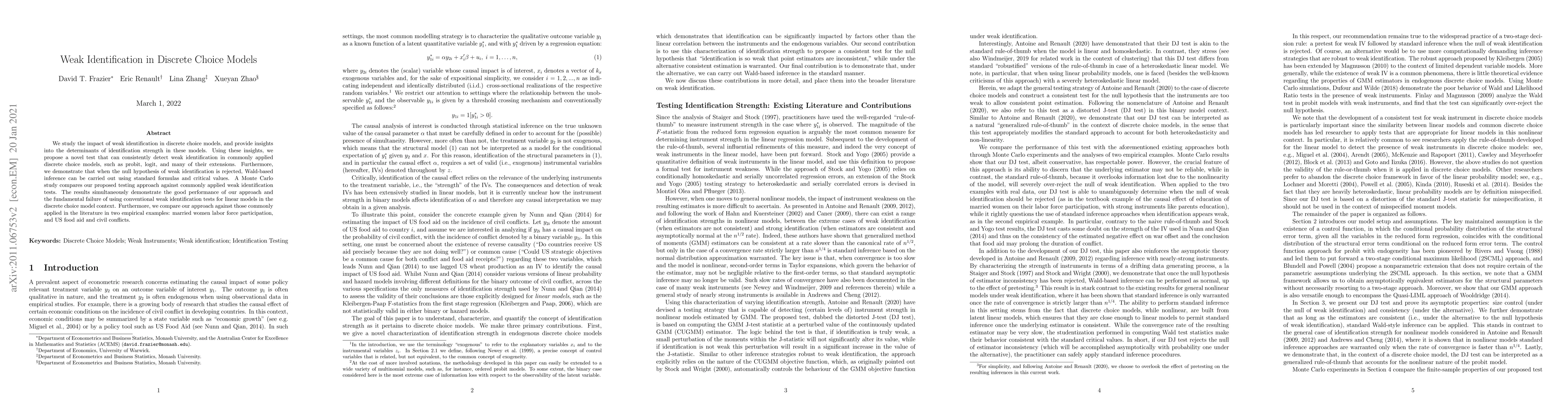 This paper investigates weak identification in discrete choice models, proposing a novel test to consistently detect it. It demonstrates the inadequacy of conventional tests for linear models in this context and showcases the effectiveness of the new approach through Monte Carlo simulations and empirical examples.