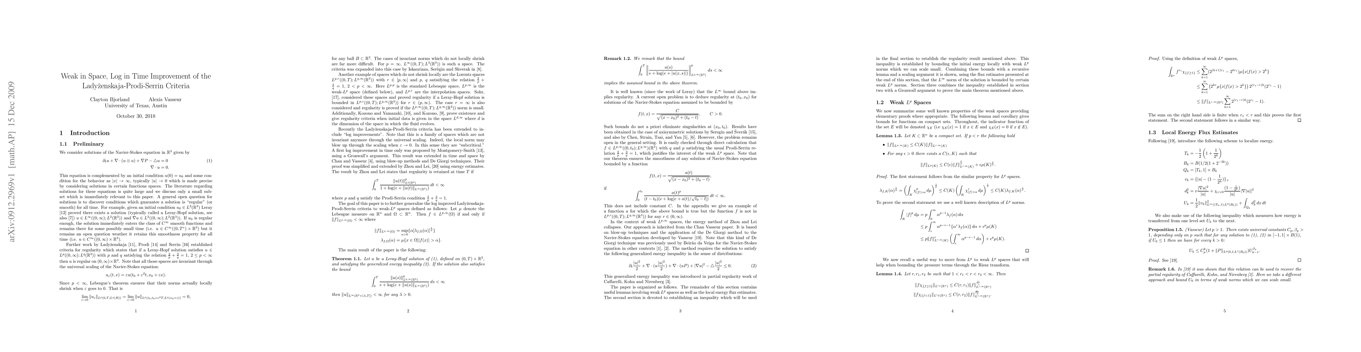 In this article we present a Lady{\v{z}}enskaja-Prodi-Serrin Criteria for regularity of solutions for the Navier-Stokes equation in three dimensions which incorporates weak $L^p$ norms in the space variables and log improvement in the time variable.