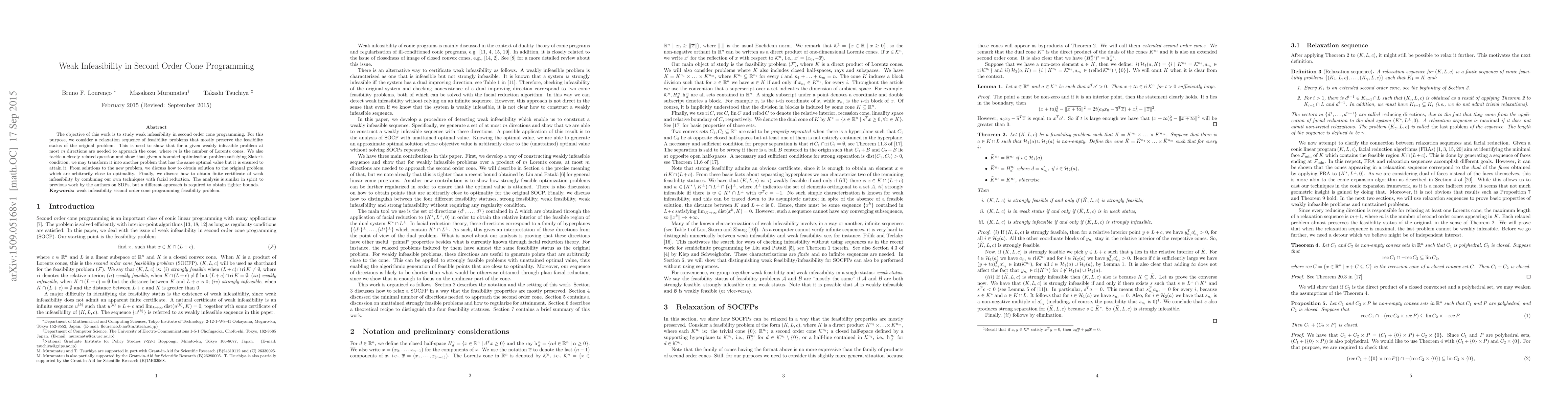 Researchers studied weak infeasibility in second-order cone programming, finding that a problem can only approach its feasible set in at most m directions, where m is the number of Lorentz cones. They also developed techniques to transform a bounded optimization problem into another with the same optimal value and ensure it attains it.