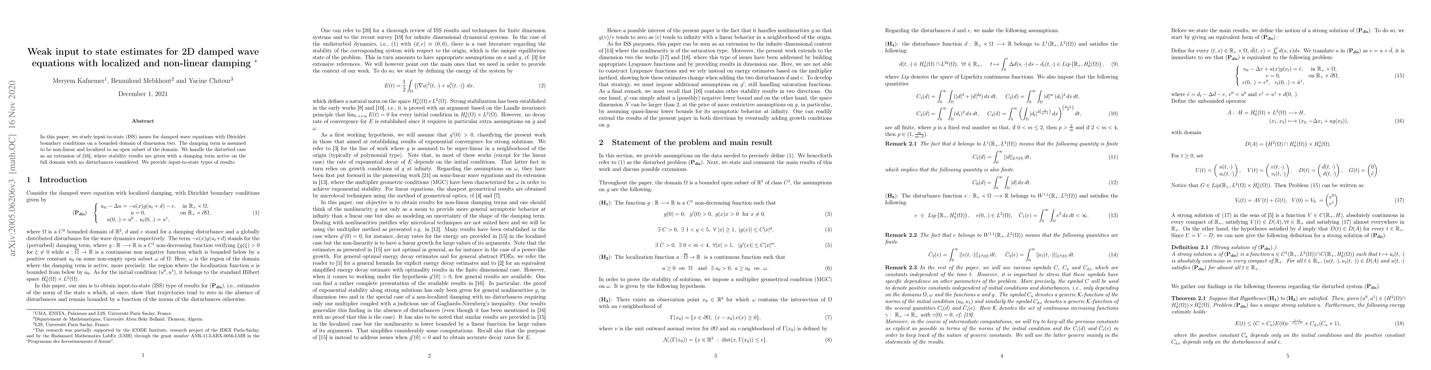 This paper investigates input-to-state stability (ISS) for 2D damped wave equations with localized, non-linear damping. It extends previous work on full-domain damping to localized damping and provides ISS results for both undisturbed and disturbed cases.