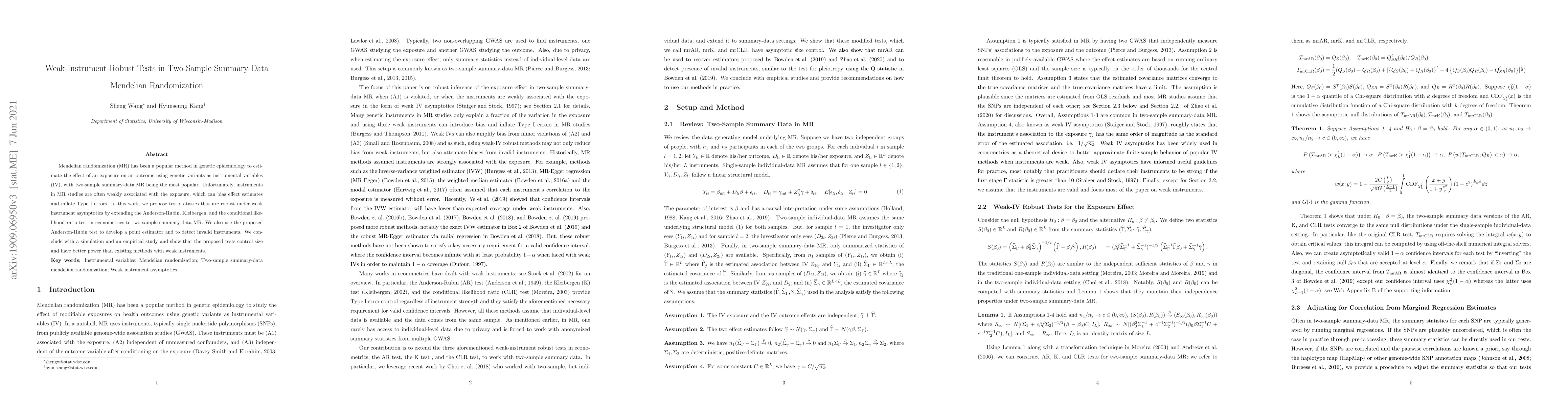 The paper proposes weak-instrument robust tests for two-sample summary-data Mendelian randomization, extending Anderson-Rubin, Kleibergen, and conditional likelihood ratio tests from econometrics.
