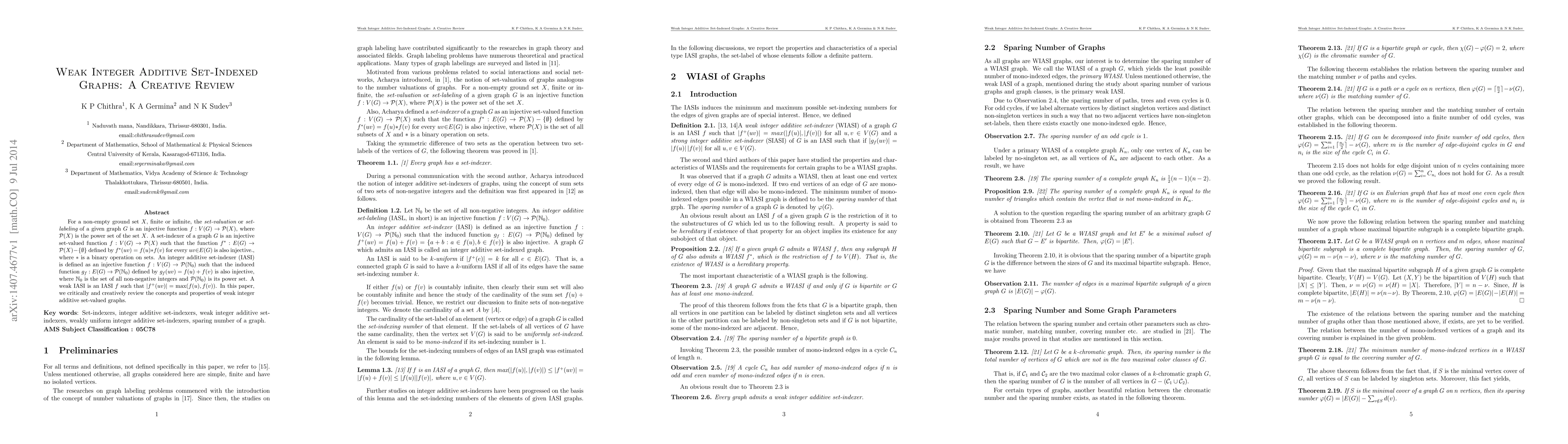 For a non-empty ground set $X$, finite or infinite, the {\em set-valuation} or {\em set-labeling} of a given graph $G$ is an injective function $f:V(G) \to \mathcal{P}(X)$, where $\mathcal{P}(X)$ is the power set of the set $X$. A set-indexer of a graph $G$ is an injective set-valued function $f:V(G) \to \mathcal{P}(X)$ such that the function $f^{\ast}:E(G)\to \mathcal{P}(X)-\{\emptyset\}$ defined by $f^{\ast}(uv) = f(u){\ast} f(v)$ for every $uv{\in} E(G)$ is also injective., where $\ast$ is a binary operation on sets. An integer additive set-indexer (IASI) is defined as an injective function $f:V(G)\to \mathcal{P}({\mathbb{N}_0})$ such that the induced function $g_f:E(G) \to \mathcal{P}(\mathbb{N}_0)$ defined by $g_f (uv) = f(u)+ f(v)$ is also injective, where $\mathbb{N}_0$ is the set of all non-negative integers and $\mathcal{P}(\mathbb{N}_0)$ is its power set. A weak IASI is an IASI $f$ such that $|f^+(uv)|= \text{max}(f(u),f(v))$. In this paper, we critically and creatively review the concepts and properties of weak integer additive set-valued graphs.