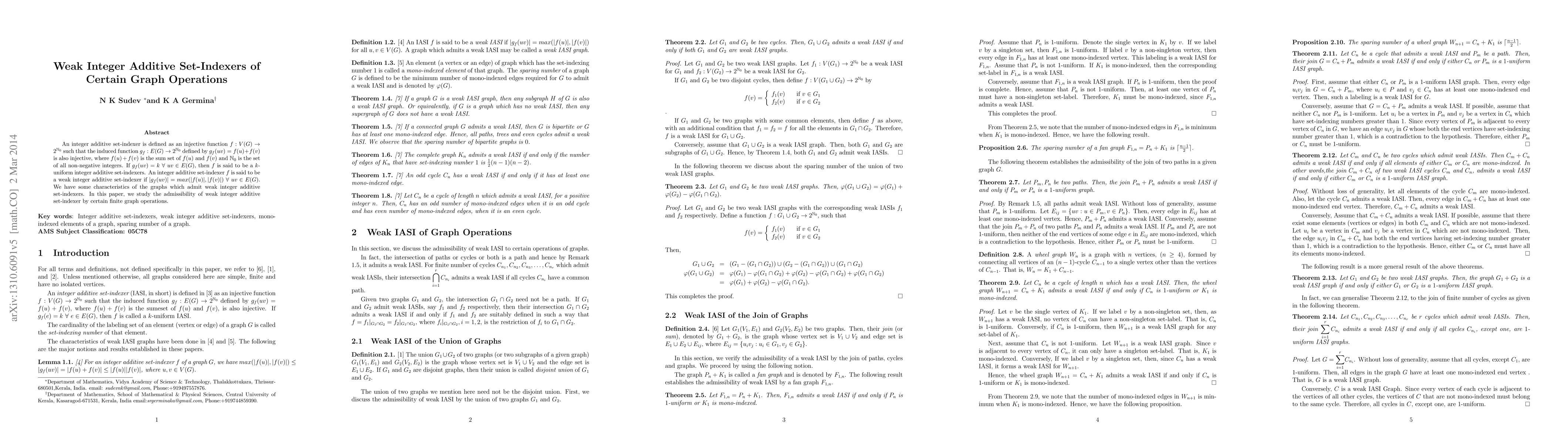 This paper explores the concept of weak integer additive set-indexers, focusing on injective functions that define graph vertex and edge sets. It investigates the admissibility of these set-indexers in graphs undergoing specific finite graph operations.