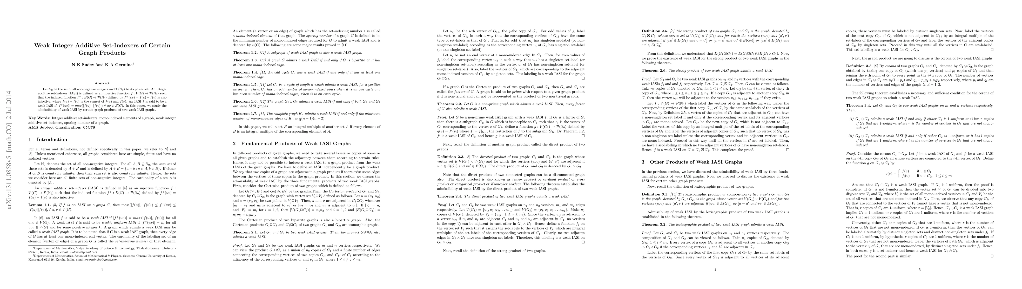 An integer additive set-indexer is defined as an injective function $f:V(G)\rightarrow 2^{\mathbb{N}_0}$ such that the induced function $g_f:E(G) \rightarrow 2^{\mathbb{N}_0}$ defined by $g_f (uv) = f(u)+ f(v)$ is also injective, where $f(u)+f(v)$ is the sumset of $f(u)$ and $f(v)$. If $g_f(uv)=k \forall uv\in E(G)$, then $f$ is said to be a $k$-uniform integer additive set-indexers. An integer additive set-indexer $f$ is said to be a weak integer additive set-indexer if $|g_f(uv)|=max(|f(u)|,|f(v)|) \forall uv\in E(G)$. We have some characteristics of the graphs which admit weak integer additive set-indexers. We already have some results on the admissibility of weak integer additive set-indexer by certain graphs and finite graph operations. In this paper, we study further characteristics of certain graph products like cartesian product and corona of two weak IASI graphs and their admissibility of weak integer additive set-indexers and provide some useful results on these types of set-indexers.