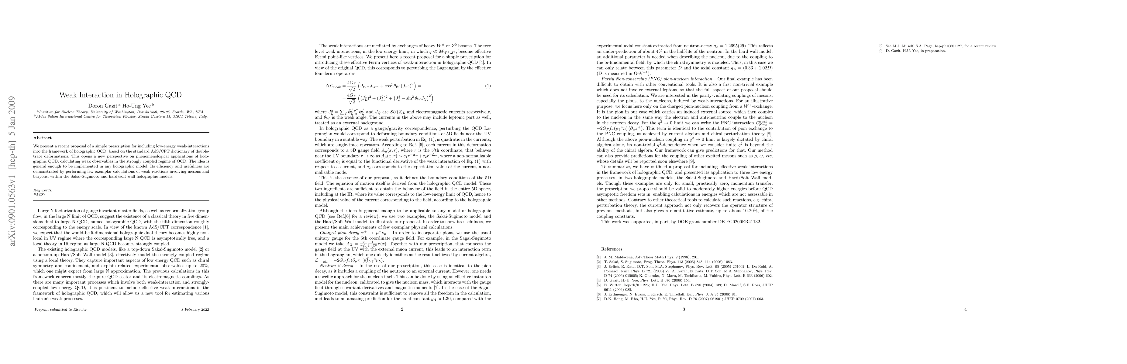 This paper proposes a method to incorporate low-energy weak interactions into holographic QCD using the AdS/CFT correspondence, demonstrating the feasibility through calculations of weak reactions in mesons and baryons within specific holographic models. The approach is shown to be versatile and applicable to various holographic frameworks.
