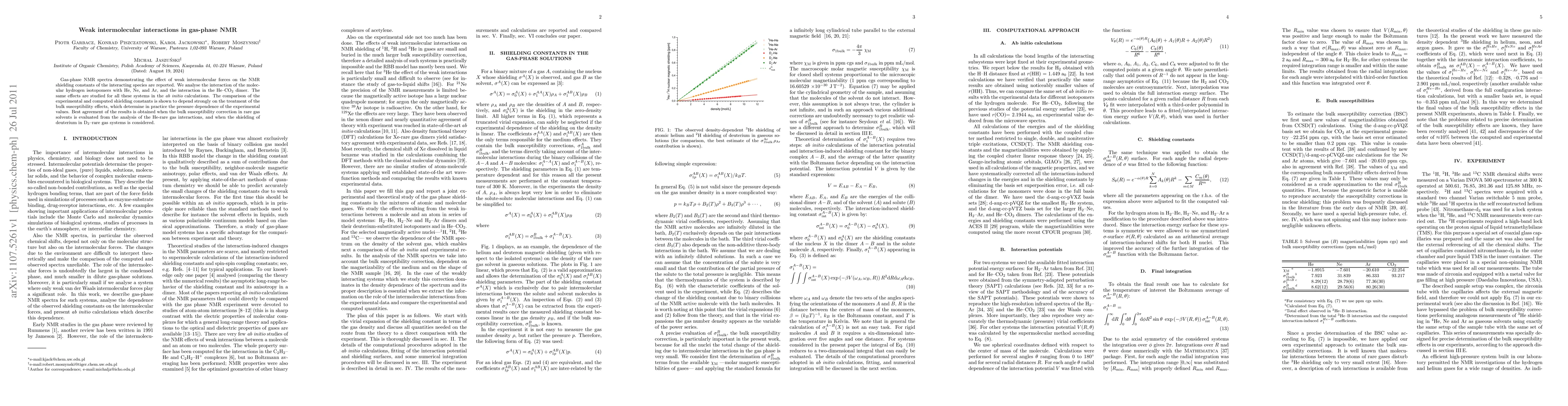 Gas-phase NMR spectra demonstrating the effect of weak intermolecular forces on the NMR shielding constants of the interacting species are reported. We analyse the interaction of the molecular hydrogen isotopomers with He, Ne, and Ar, and the interaction in the He-CO_2 dimer. The same effects are studied for all these systems in the ab initio calculations. The comparison of the experimental and computed shielding constants is shown to depend strongly on the treatment of the bulk susceptibility effects, which determine in practice the pressure dependence of the experimental values. Best agreement of the results is obtained when the bulk susceptibility correction in rare gas solvents is evaluated from the analysis of the He-rare gas interactions, and when the shielding of deuterium in D_2-rare gas systems is considered.