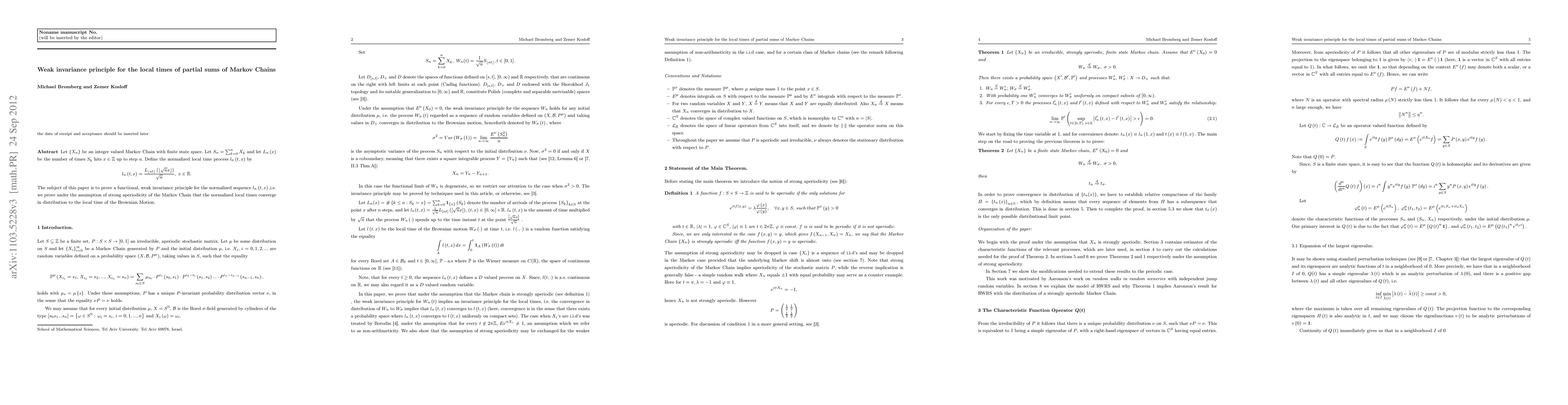 Let X_{n} be an integer valued Markov Chain with finite state space. Let S_{n}=\sum_{k=0}^{n}X_{k} and let L_{n}(x) be the number of times S_{k} hits x up to step n. Define the normalized local time process t_{n}(x) by t_{n}(x)=\frac{L_{n}(\sqrt{n}(x)}{\sqrt{n}}. The subject of this paper is to prove a functional, weak invariance principle for the normalized sequence t_{n}, i.e. we prove that under some assumptions about the Markov Chain, the normalized local times converge in distribution to the local time of the Brownian Motion.