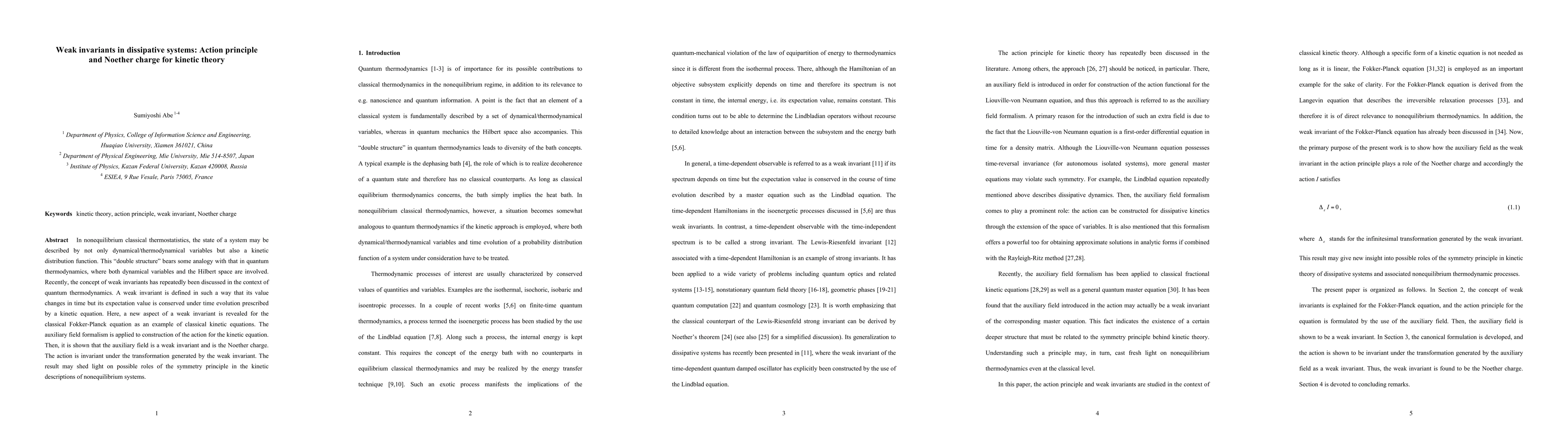 In nonequilibrium classical thermostatistics, the state of a system may be described by not only dynamical/thermodynamical variables but also a kinetic distribution function. This "double structure" bears some analogy with that in quantum thermodynamics, where both dynamical variables and the Hilbert space are involved. Recently, the concept of weak invariants has repeatedly been discussed in the context of quantum thermodynamics. A weak invariant is defined in such a way that its value changes in time but its expectation value is conserved under time evolution prescribed by a kinetic equation. Here, a new aspect of a weak invariant is revealed for the classical Fokker-Planck equation as an example of classical kinetic equations. The auxiliary field formalism is applied to construction of the action for the kinetic equation. Then, it is shown that the auxiliary field is a weak invariant and is the Noether charge. The action is invariant under the transformation generated by the weak invariant. The result may shed light on possible roles of the symmetry principle in the kinetic descriptions of nonequilibrium systems.