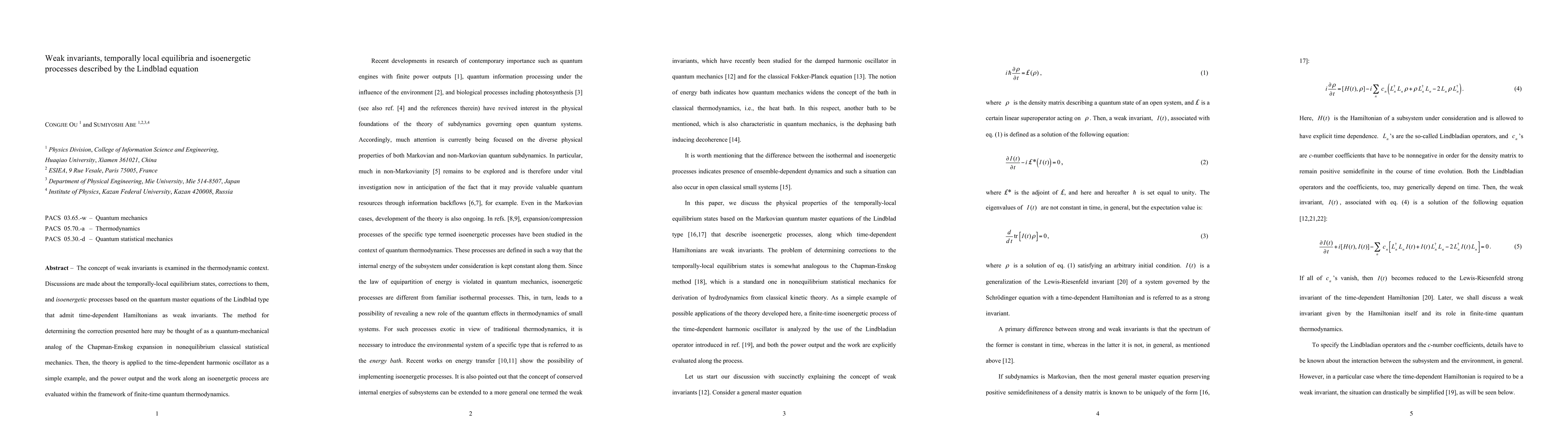 The concept of weak invariants is examined in the thermodynamic context. Discussions are made about the temporally-local equilibrium states, corrections to them, and isoenergetic processes based on the quantum master equations of the Lindblad type that admit time-dependent Hamiltonians as weak invariants. The method for determining the correction presented here may be thought of as a quantum-mechanical analog of the Chapman-Enskog expansion in nonequilibrium classical statistical mechanics. Then, the theory is applied to the time-dependent harmonic oscillator as a simple example, and the power output and the work along an isoenergetic process are evaluated within the framework of finite-time quantum thermodynamics.