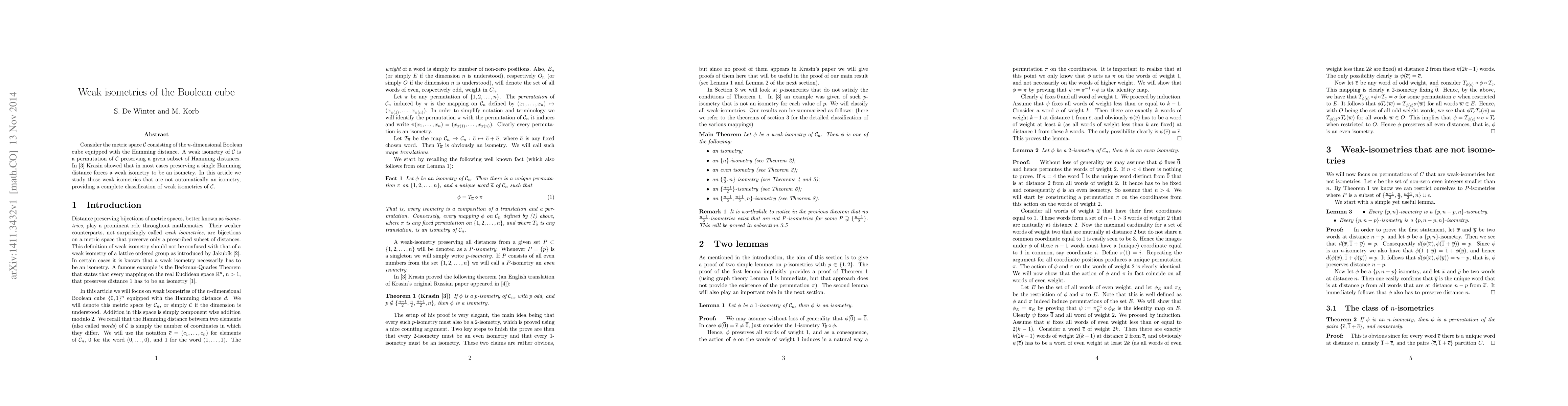 Consider the metric space $\mathcal{C}$ consisting of the $n$-dimensional Boolean cube equipped with the Hamming distance. A weak isometry of $\mathcal{C}$ is a permutation of $\mathcal{C}$ preserving a given subset of Hamming distances. In \cite{Krasin} Krasin showed that in most cases preserving a single Hamming distance forces a weak isometry to be an isometry. In this article we study those weak isometries that are not automatically an isometry, providing a complete classification of weak isometries of $\mathcal{C}$.