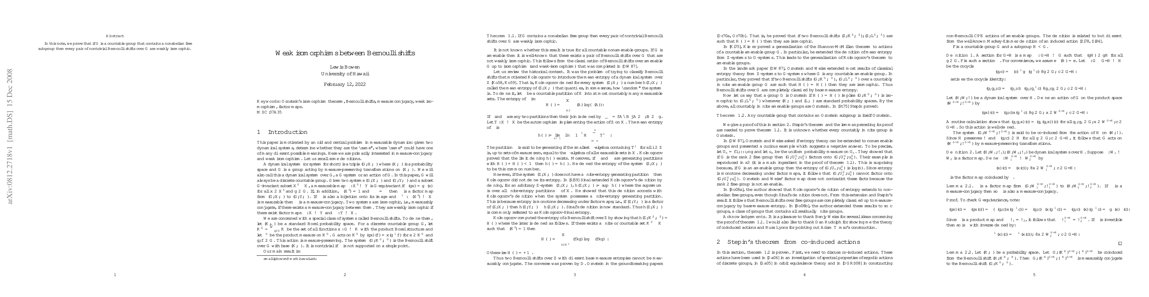 Summary: This paper demonstrates that any two nontrivial Bernoulli shifts over a countable group G containing a nonabelian free subgroup are weakly isomorphic, establishing a significant result in the study of dynamical systems.