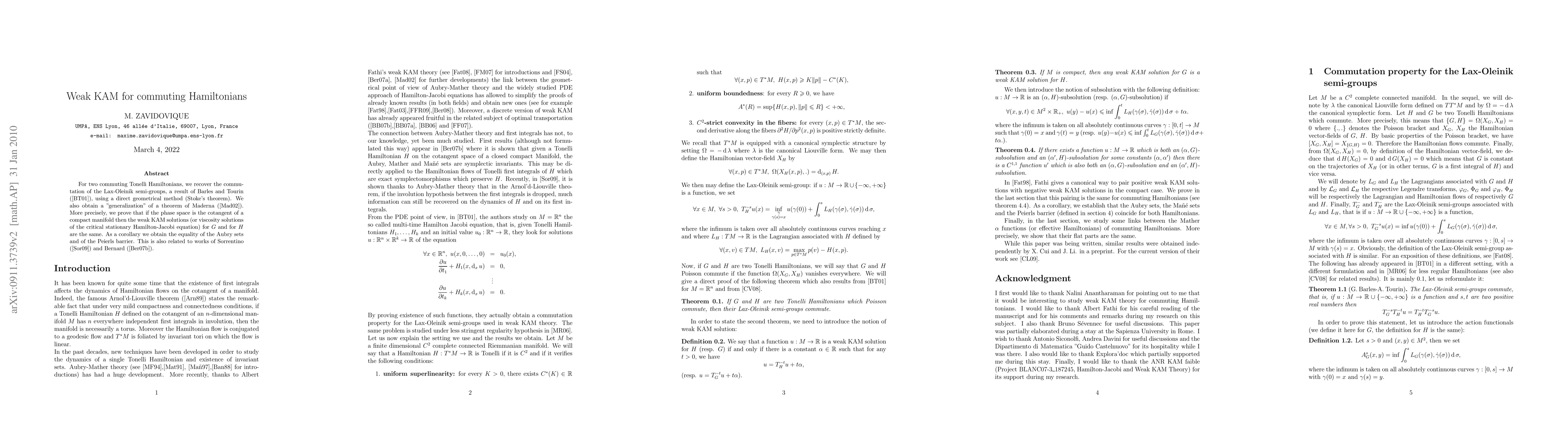For two commuting Tonelli Hamiltonians, we recover the commutation of the Lax-Oleinik semi-groups, a result of Barles and Tourin ([BT01]), using a direct geometrical method (Stoke's theorem). We also obtain a "generalization" of a theorem of Maderna ([Mad02]). More precisely, we prove that if the phase space is the cotangent of a compact manifold then the weak KAM solutions (or viscosity solutions of the critical stationary Hamilton-Jacobi equation) for G and for H are the same. As a corrolary we obtain the equality of the Aubry sets, of the Peierls barrier and of flat parts of Mather's $\alpha$ functions. This is also related to works of Sorrentino ([Sor09]) and Bernard ([Ber07b]).