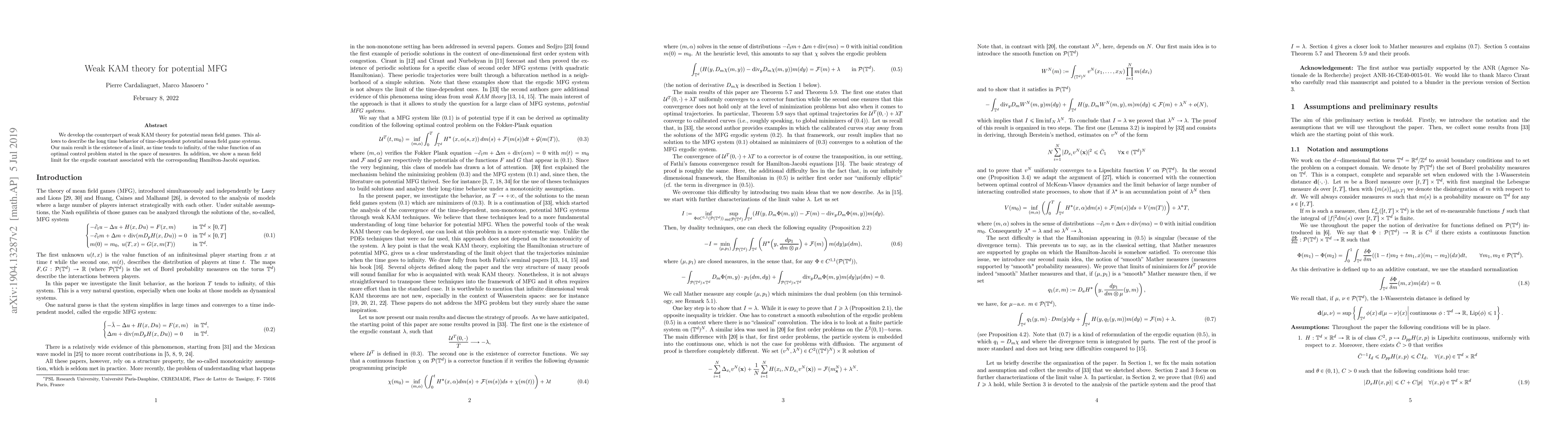 We develop the counterpart of weak KAM theory for potential mean field games. This allows to describe the long time behavior of time-dependent potential mean field game systems. Our main result is the existence of a limit, as time tends to infinity, of the value function of an optimal control problem stated in the space of measures. In addition, we show a mean field limit for the ergodic constant associated with the corresponding Hamilton-Jacobi equation.