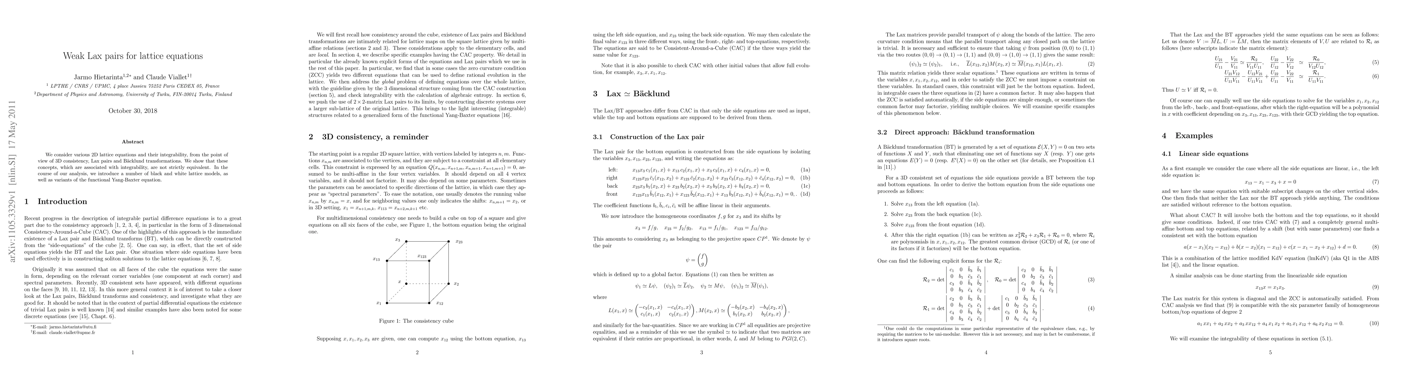 This paper explores the integrability of 2D lattice equations through 3D consistency, Lax pairs, and Bäcklund transformations, revealing that these concepts are not strictly equivalent. It introduces new lattice models and variants of the functional Yang-Baxter equation in the process.