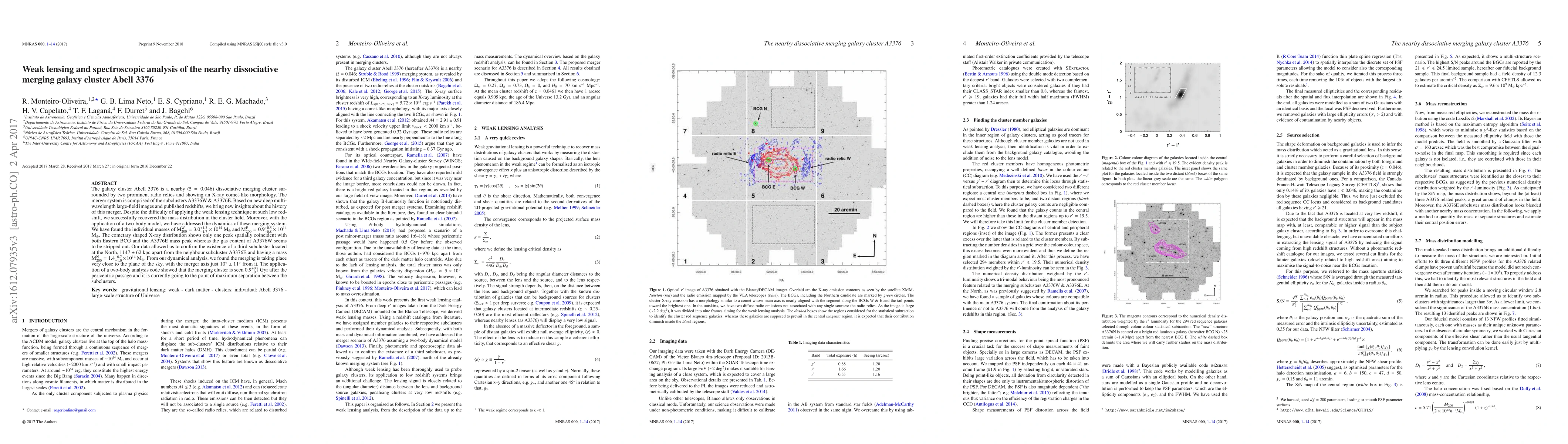 The galaxy cluster Abell~3376 is a nearby (z=0.046) dissociative merging cluster surrounded by two prominent radio relics and showing an X-ray comet-like morphology. The merger system is comprised of the subclusters A3376W & A3376E. Based on new deep multi-wavelength large-field images and published redshifts, we bring new insights about the history of this merger. Despite the difficulty of applying the weak lensing technique at such low redshift, we successfully recovered the mass distribution in the cluster field. Moreover, with the application of a two-body model, we have addressed the dynamics of these merging system. We have found the individual masses of M_{200}^{W}=3.0_{-1.7}^{+1.3}x10^{14} M_{\odot} and M_{200}^{E}=0.9_{-0.8}^{+0.5}x10^{14} M_{\odot}. The cometary shaped X-ray distribution shows only one peak spatially coincident with both Eastern BCG and the A3376E mass peak whereas the gas content of A3376W seems to be stripped out. Our data allowed us to confirm the existence of a third subcluster located at the North, 1147+-62 kpc apart from the neighbour subcluster A3376E and having a mass M_{200}^{N}=1.4_{-1.0}^{+0.7}x10^{14} M_{\odot}. From our dynamical analysis, we found the merging is taking place very close to the plane of the sky, with the merger axis just 10 deg +-11 deg from it. The application of a two-body analysis code showed that the merging cluster is seen 0.9_{-0.3}^{+0.2} Gyr after the pericentric passage and it is currently going to the point of maximum separation between the subclusters.