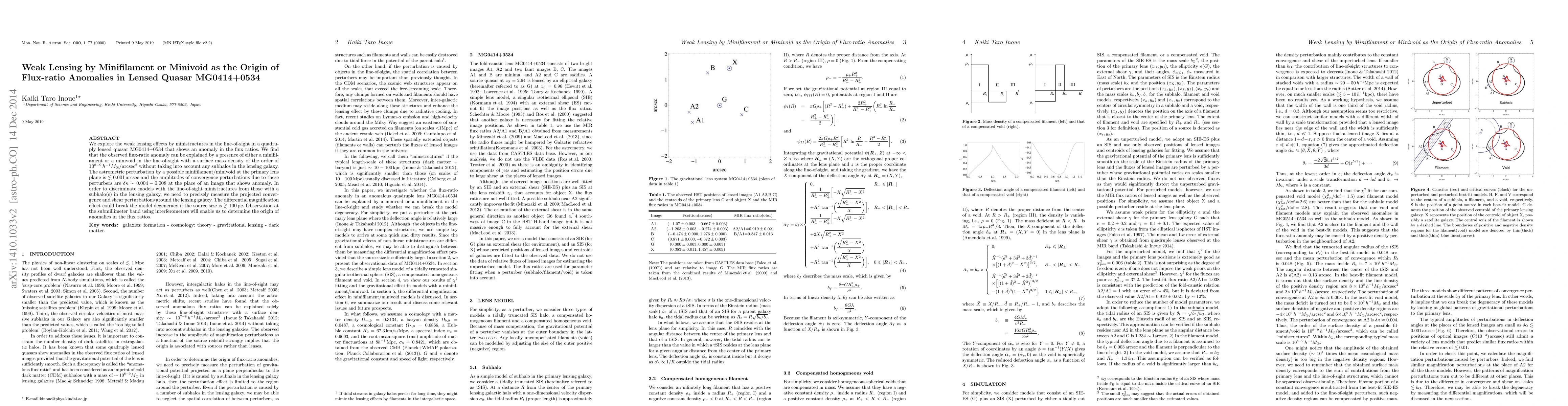 We explore the weak lensing effects by ministructures in the line-of-sight in a quadruply lensed quasar MG0414+0534 that shows an anomaly in the flux-ratios. We find that the observed flux-ratio anomaly can be explained by a presence of either a minifilament or a minivoid in the line-of-sight with a surface mass density of the order of 10^(8-9) h^(-1) solar mass /arcsec^2 without taking into account any subhalos in the lensing galaxy. The astrometric perturbation by a possible minifilament/minivoid is <~ 0.001 arcsec and the amplitudes of convergence perturbations due to these perturbers are ~ 0.004-0.008 at the place of an image that shows anomaly. In order to discriminate models with the line-of-sight ministructures from those with a subhalo(s) in the lensing galaxy, we need to precisely measure the projected convergence and shear around the lensing galaxy. The differential magnification effect could break the model degeneracy if the source size is > ~100 pc. Observation at the submillimeter band using interferometers will enable us to determine the origin of anomalies in the flux ratios.