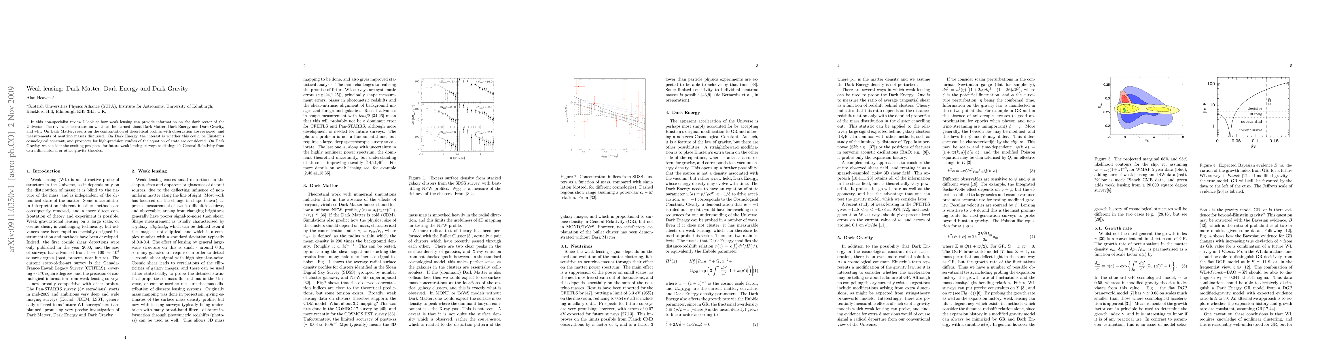In this non-specialist review I look at how weak lensing can provide information on the dark sector of the Universe. The review concentrates on what can be learned about Dark Matter, Dark Energy and Dark Gravity, and why. On Dark Matter, results on the confrontation of theoretical profiles with observation are reviewed, and measurements of neutrino masses discussed. On Dark Energy, the interest is whether this could be Einstein's cosmological constant, and prospects for high-precision studies of the equation of state are considered. On Dark Gravity, we consider the exciting prospects for future weak lensing surveys to distinguish General Relativity from extra-dimensional or other gravity theories.