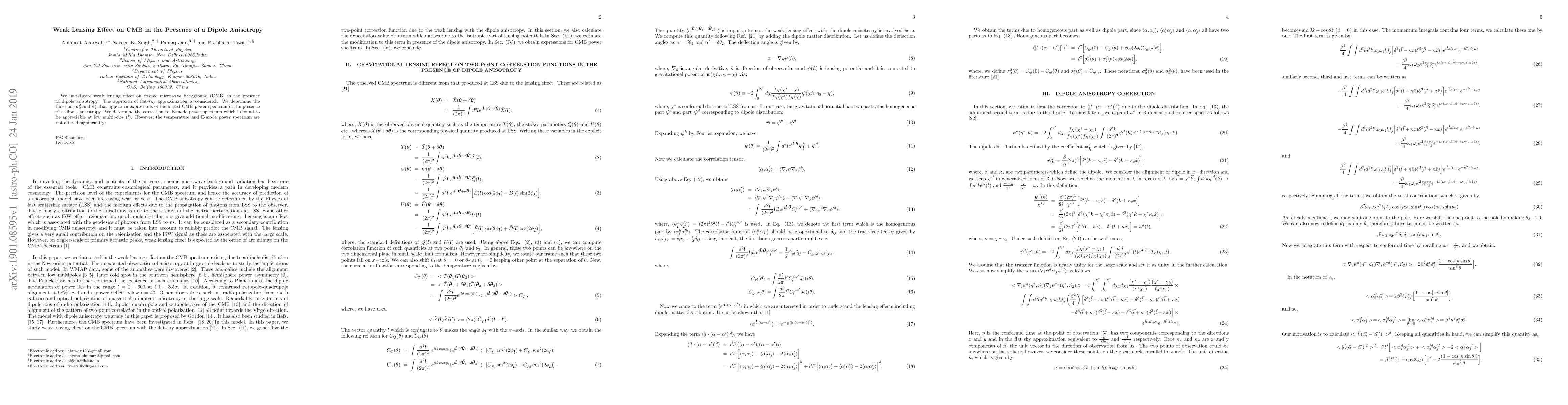 This study examines the weak lensing effect on the cosmic microwave background (CMB) with a dipole anisotropy using a flat-sky approximation. It determines correction factors for the lensed CMB power spectrum, showing significant B-mode power spectrum correction at low multipoles, while the temperature and E-mode power spectrum remain largely unaffected.