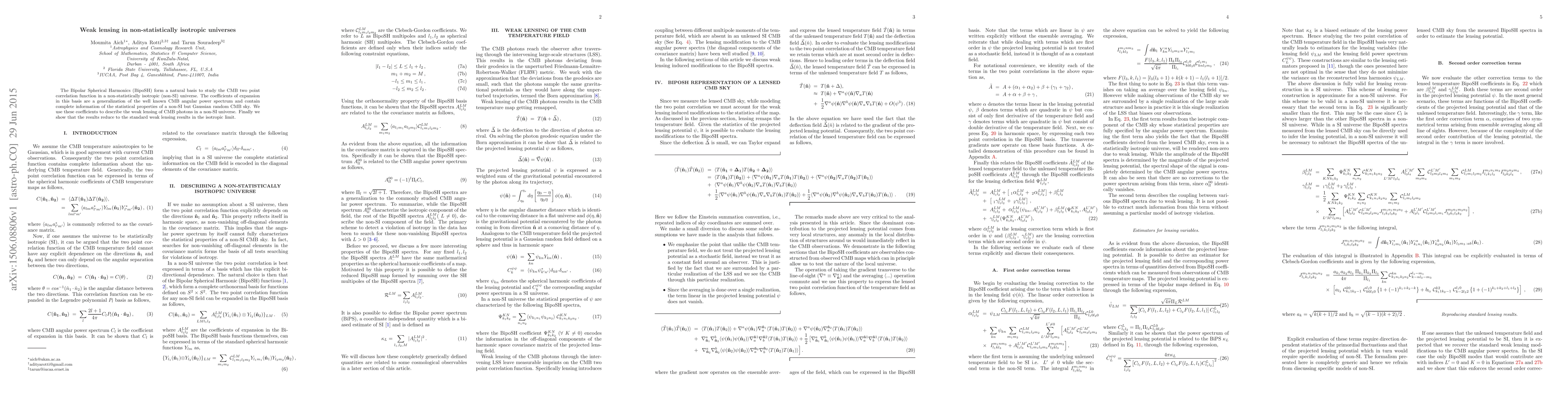 Researchers developed a method to study weak lensing in non-isotropic universes using the Bipolar Spherical Harmonics form, which provides information on CMB photon statistics and reduces to standard results in isotropic limits.