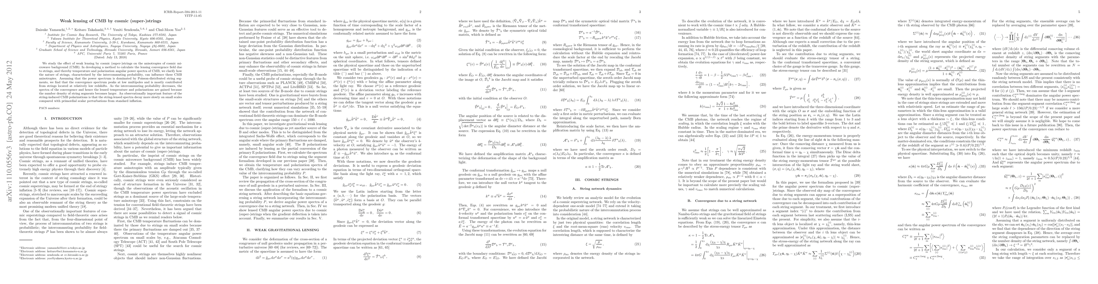This paper investigates the weak lensing effect of cosmic (super-)strings on CMB anisotropies, developing a method to calculate the lensing convergence field. It finds that lower intercommuting probabilities increase the number density of string segments, leading to a more pronounced convergence spectrum at low multipoles and a slower decay of string-lensed polarization spectra on small scales compared to standard inflationary models.
