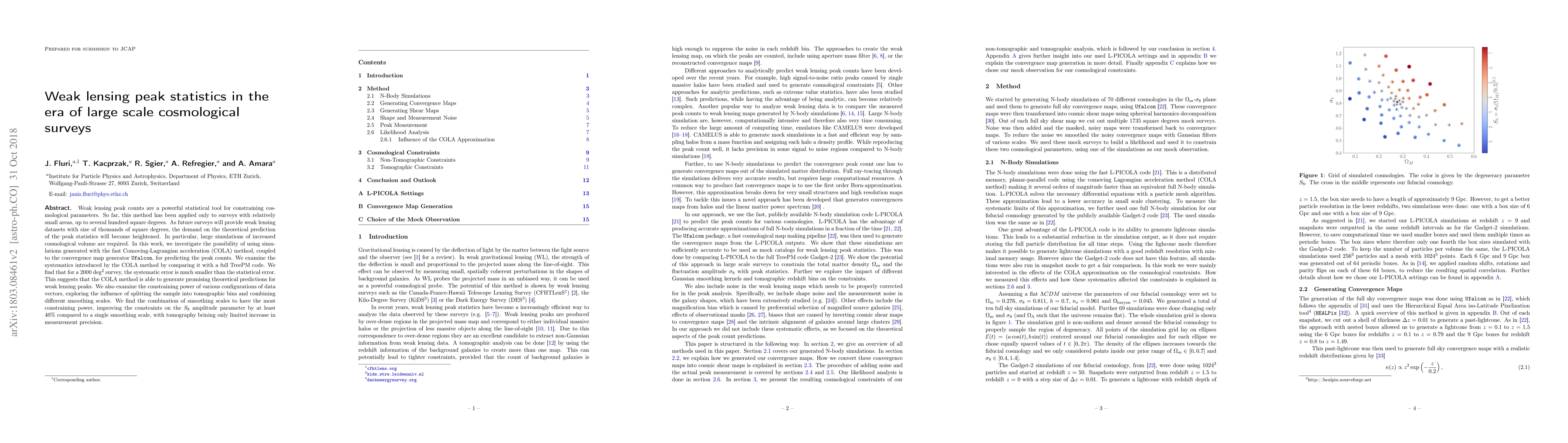 This paper investigates the use of fast cosmological simulations, specifically the COLA method combined with Ufalcon, to predict weak lensing peak statistics for large-scale surveys. The study finds that the COLA method introduces minimal systematic error compared to statistical error, making it suitable for predicting peak counts in surveys spanning thousands of square degrees. The research also finds that combining different smoothing scales enhances the constraining power on cosmological parameters, particularly the $S_8$ amplitude, by at least 40% compared to using a single smoothing scale.