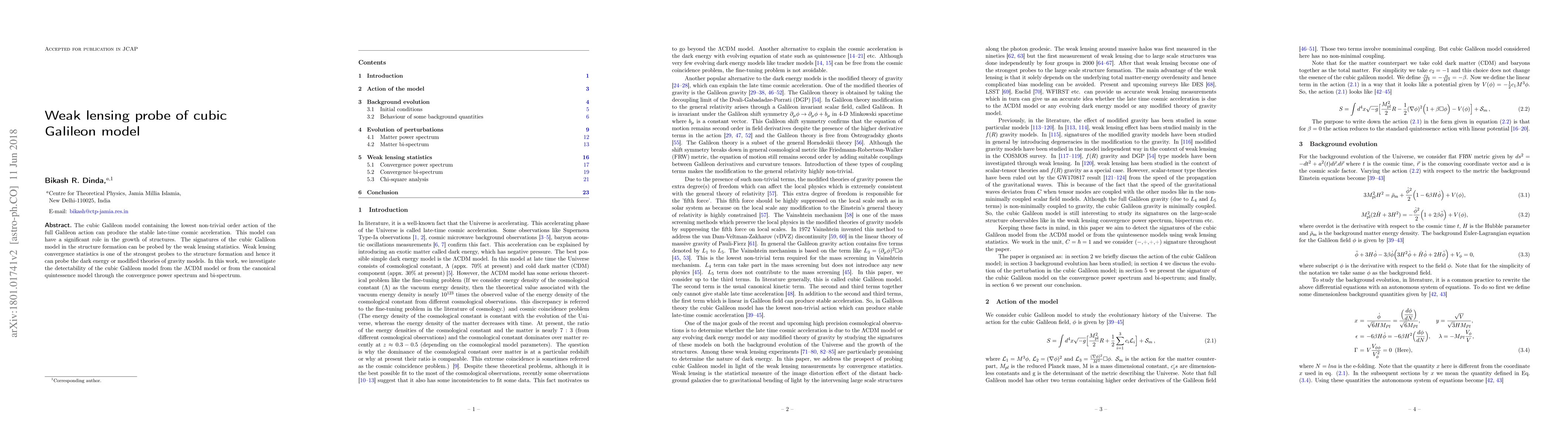 This paper explores the detectability of the cubic Galileon model, which can drive late-time cosmic acceleration, through weak lensing convergence statistics. It examines the model's signatures in structure formation by analyzing the convergence power spectrum and bi-spectrum to distinguish it from the $\Lambda$CDM and quintessence models.