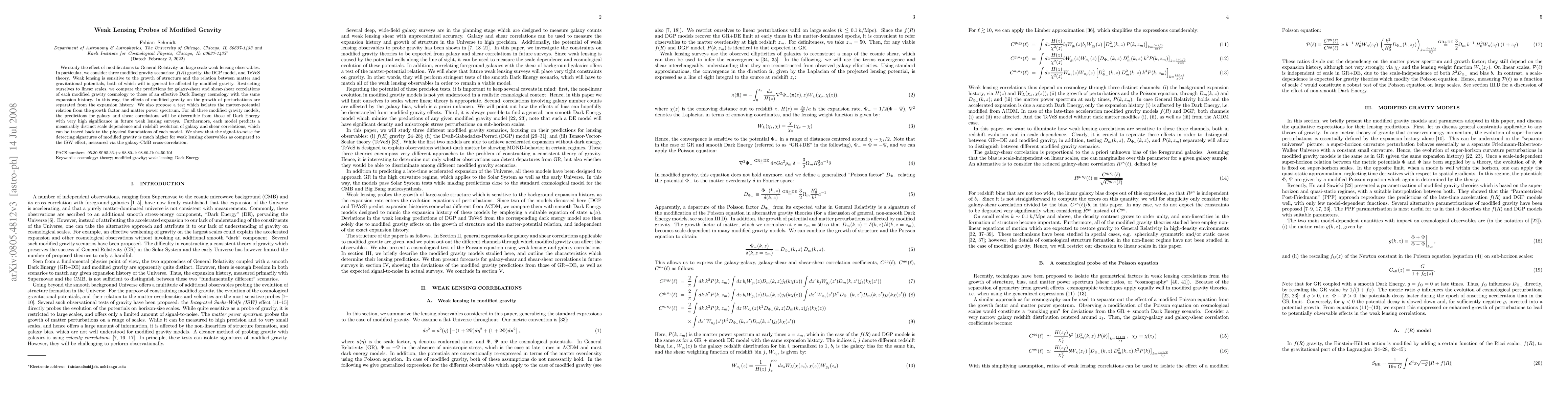 This paper investigates how modifications to General Relativity, specifically in f(R) gravity, the DGP model, and TeVeS theory, affect large-scale weak lensing observables. It finds that these modified gravity models predict distinct signatures in galaxy-shear and shear-shear correlations, distinguishable from Dark Energy models, with high significance in future surveys.