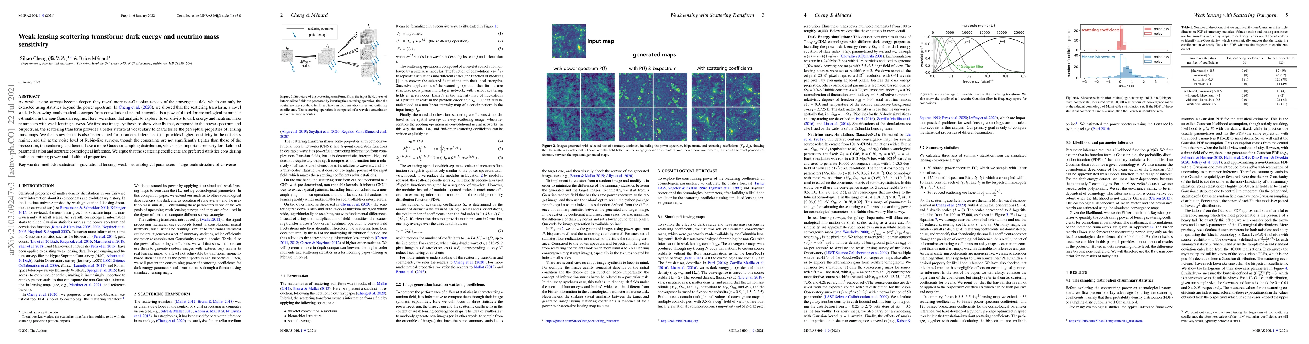 As weak lensing surveys become deeper, they reveal more non-Gaussian aspects of the convergence field which can only be extracted using statistics beyond the power spectrum. In Cheng et al. (2020) we showed that the scattering transform, a novel statistic borrowing mathematical concepts from convolutional neural networks, is a powerful tool for cosmological parameter estimation in the non-Gaussian regime. Here, we extend that analysis to explore its sensitivity to dark energy and neutrino mass parameters with weak lensing surveys. We first use image synthesis to show visually that, compared to the power spectrum and bispectrum, the scattering transform provides a better statistical vocabulary to characterize the perceptual properties of lensing mass maps. We then show that it is also better suited for parameter inference: (i) it provides higher sensitivity in the noiseless regime, and (ii) at the noise level of Rubin-like surveys, though the constraints are not significantly tighter than those of the bispectrum, the scattering coefficients have a more Gaussian sampling distribution, which is an important property for likelihood parametrization and accurate cosmological inference. We argue that the scattering coefficients are preferred statistics considering both constraining power and likelihood properties.