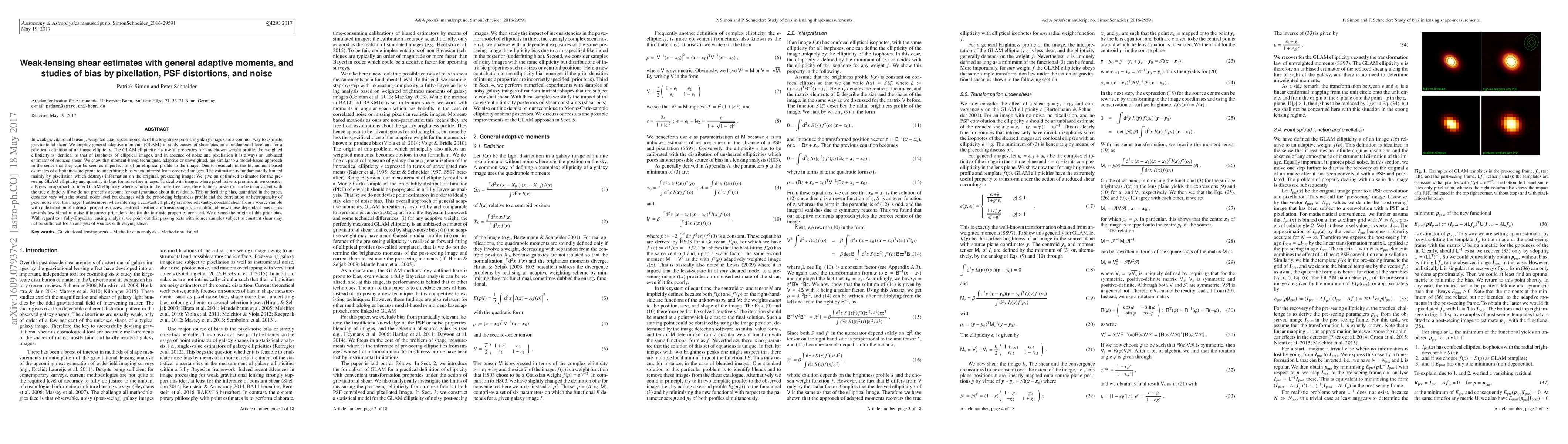This paper investigates the estimation of gravitational shear using general adaptive moments (GLAM) in weak lensing, highlighting biases due to pixellation, point spread function (PSF) distortions, and noise. It proposes an optimized estimator for GLAM ellipticity, demonstrating its bias in noise-free scenarios and discussing the impact of incorrect priors on the inferred shear.